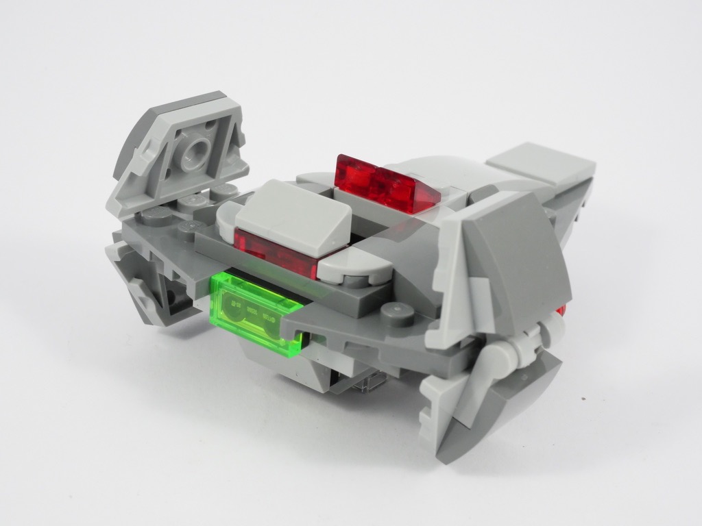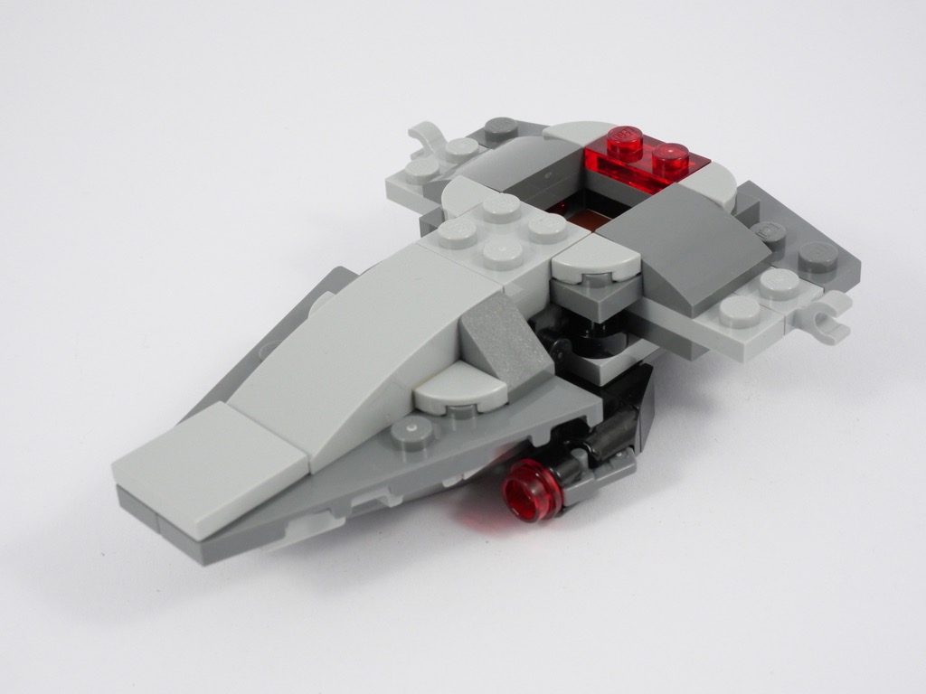 La fidélité au vaisseau original est rarement le point fort de ces Microfighters, et celui-ci ne fait pas exception à la règle : l’échelle retenue ne permet évidemment pas une reproduction dans les moindres détails. Néanmoins, il ne s’en sort pas si mal : les fans avertis reconnaîtront tout de même l’engin au premier coup d’oeil, avec sa forme allongée et ses ailes caractéristiques. Pour les couleurs, on retrouve les classiques de la gamme LEGO Star Wars : du noir, du gris, et du trans red (parce que c’est un méchant !).