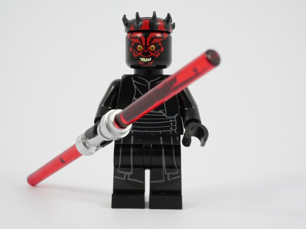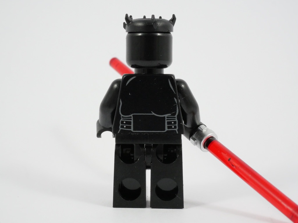 Le torse et les jambes sont tampographiées de gris sur fond noir. C’est très détaillé, et bien réalisé. Le raccord entre la ceinture et le torse est (presque) parfait. Darth Maul arbore un sourire menaçant sur son visage très bien réalisé également. Il s’agit en fait d’une tête standard, sur laquelle est rapportée un « couronne » à pointes… c’est d’ailleurs le reproche que l’on pourra faire à cette minifig : la démarcation est vraiment visible et nuit à l’aspect général.