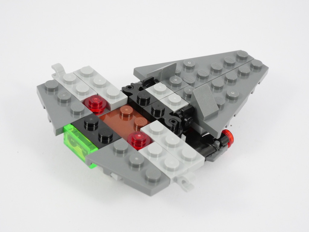 Comme vous devez vous en douter, la construction est plutôt rapide avec 92 pièces au compteur. On commence par la « base » du vaisseau avec quelques briques SNOT qui permettent de fixer le « réacteur » (une simple tile en trans bright green) et les deux stud-shooters. On y superpose le poste de pilotage (en fait une place de 2×2 tenons pour y installer Darth Maul). On termine avec les ailes, dont les parties courbes sont clipsées sur le corps du vaisseau. Pas de « bon angle » à trouver ici : en pliant les ailes en butée, le rendu est parfaitement symétrique.