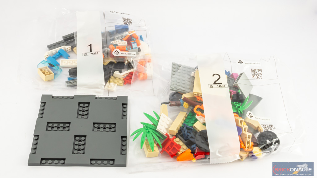 A l’intérieur de la boîte, nous trouvons deux sachets de pièces numérotés, une plaque de route « modulaire » de 16×16 tenons, deux notices d’instructions et une planche de 4 autocollants.