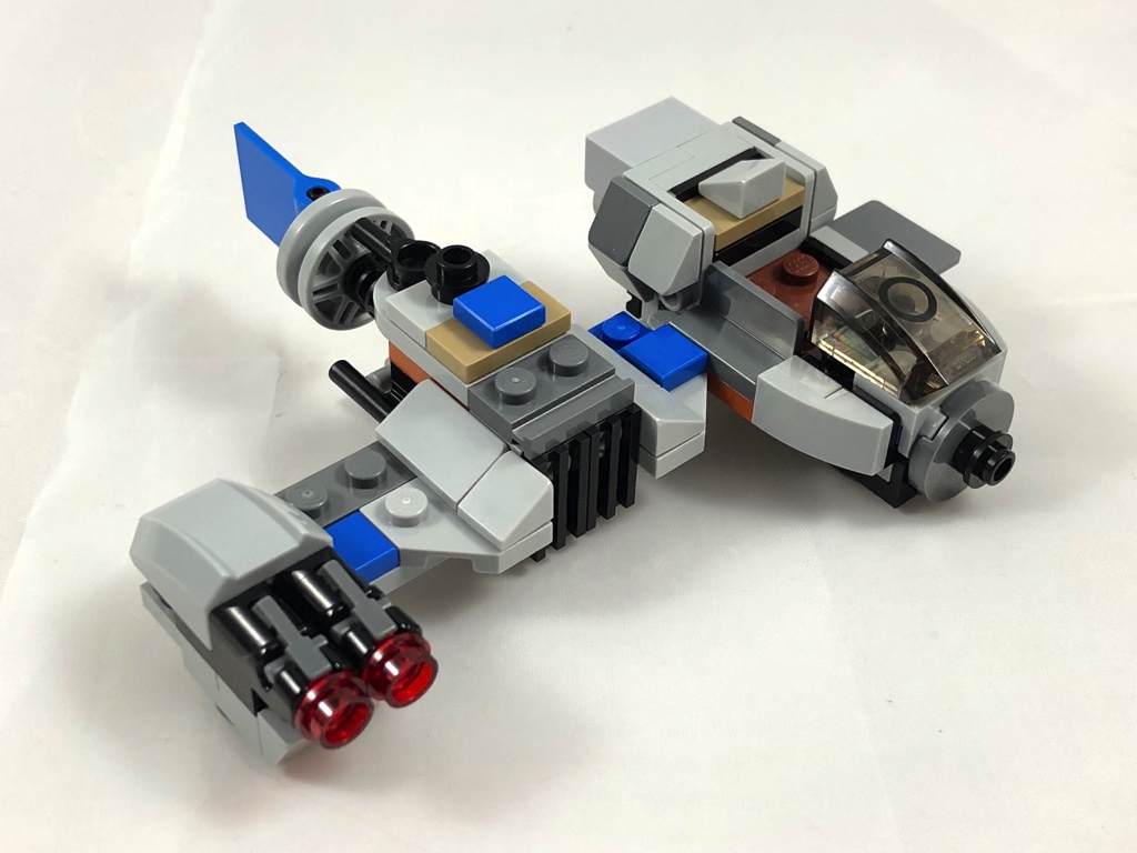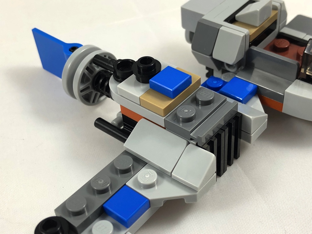 La base du Ski Speeder est une plate 2×12, sur laquelle viennent se fixer les différents éléments. On commence par y ajouter le cockpit, avec sa verrière et de quoi y installer le pilote. On décore ce cockpit, puis on s’attaque à la partie centrale du Speeder, composée pour l’essentiel d’un gros réacteur et d’une gouverne bleue. Enfin, on termine avec l’autre extrémité, et ses deux studs shooters, dont la position correspond plutôt bien avec la version « originale ».