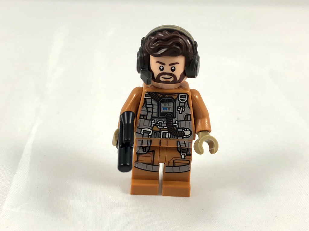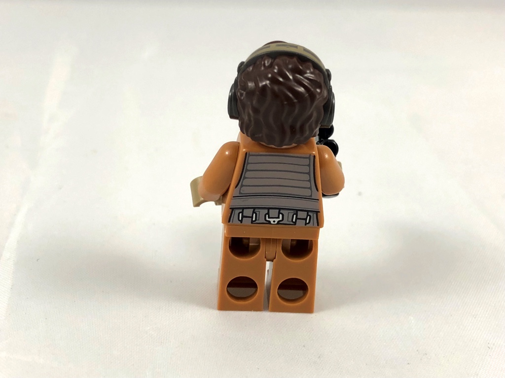 Très belle réalisation également que ce pilote de la résistance. On retrouve la combinaison dark orange, superbement détaillée avec ses lanières, ses tuyaux et ses poches. Le torse, la ceinture et les jambes sont tampographiés. Le visage barbu n’est pour le moment disponible que dans ce set et le 75189 – First Order Heavy Assault Walker, tandis qu’on trouve sa combinaison dans 3 minifigs du 75188 – Resistance Bomber. Enfin, il porte sur la tête un casque audio équipé d’un micro, au dessus d’une chevelure en dark brown elle aussi joliment détaillée. Cette pièce est pour le moment exclusive à notre petit set dans cette couleur, Poe Dameron ayant la même en noir dans le set 75202 – Defense of Crait. Notre pilote porte un blaster afin de se défendre.