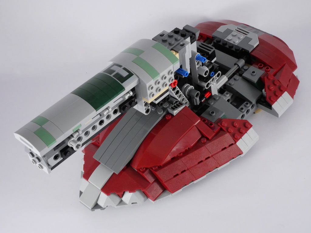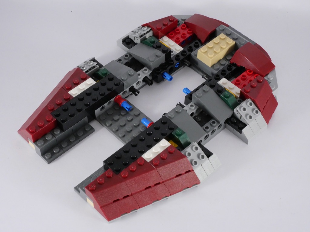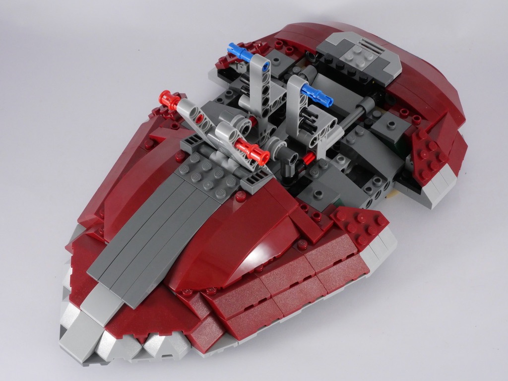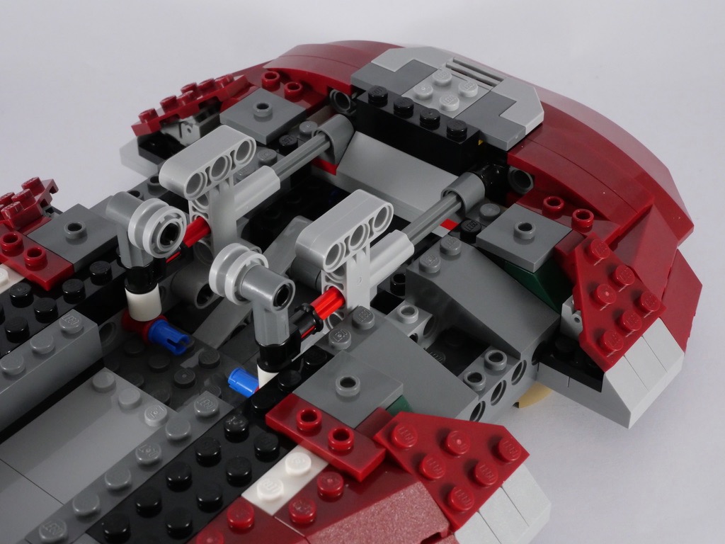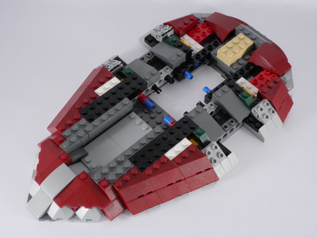 Avec le 2ème sachet, nous allons pour l’essentiel continuer à habiller cette structure, à l’aide de nombreuses slopes couleur dark red. Quelques pièces sont fixées sur des charnières afin d’obtenir l’angle désiré. On termine cette étape avec l’ajout de la partie basse (la pointe) qui contient la cale dans laquelle Boba Fett transporte Han Solo, une fois celui-ci dans la carbonite.