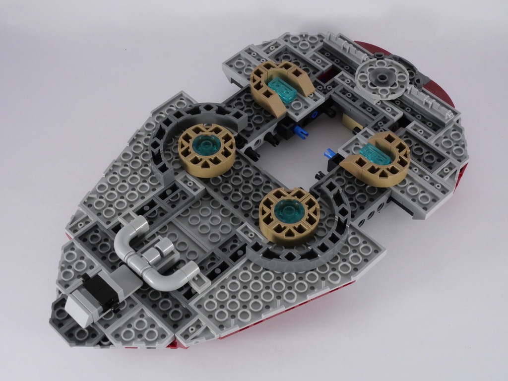 On passe ensuite à l’habillage de la partie supérieure du vaisseau, constitué de 6 sous-assemblages que l’on vient ensuite fixer sur la structure. Ces sous assemblages sont fixés pour certains sur des clips, pour d’autres sur des pièces SNOT, et pour les derniers sur des pins technic.