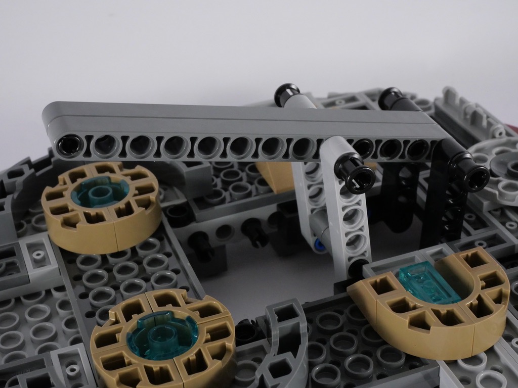 En parlant de public visé, il est clair que ce set s’adresse aux plus jeunes comme l’indique la mention « 10+ » sur la boîte. En effet, plutôt qu’une maquette destinée à être exposée, nous avons dans les mains un vrai jouet. Le vaisseau regorge de fonctionnalités, depuis les canons mobiles jusqu’à la trappe permettant d’y placer Han Solo congelé dans la carbonite. Mais la plus intéressante, et la mieux pensée, réside dans les 2 spring shooters situés juste sous le cockpit. En tenant le vaisseau par la poignée rétractable, ces canons sont activés par un mécanisme très discret situé à l’arrière du vaisseau. C’est redoutablement efficace. Ladite poignée rétractable est également très bien pensée, et la solidité du vaisseau permettra sans crainte de le faire voler dans le salon.
