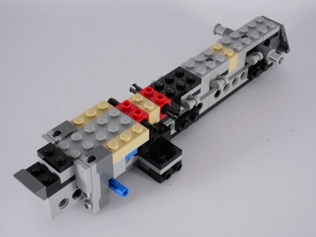 Retour de l’autre côté avec l’étape suivante, où l’on construit le système d’éjection des « lasers » (deux spring shooters qu’on ajoutera bien plus tard). C’est tout bête, mais très ingénieux : deux tiges, actionnables depuis l’arrière du vaisseau (donc en tenant celui-ci par sa fameuse poignée rétractable), permettent l’éjection. On ajoute également dans cette étape la trappe d’accès à la soute, et les pièces technic qui recevront la partie supérieure du vaisseau.