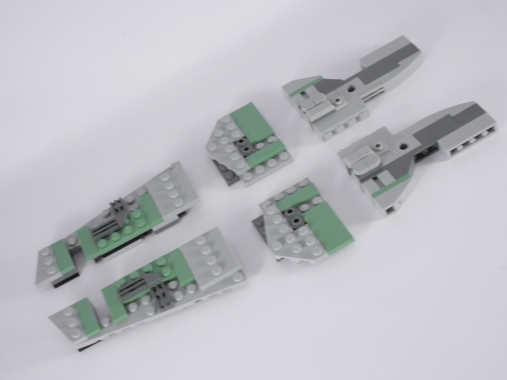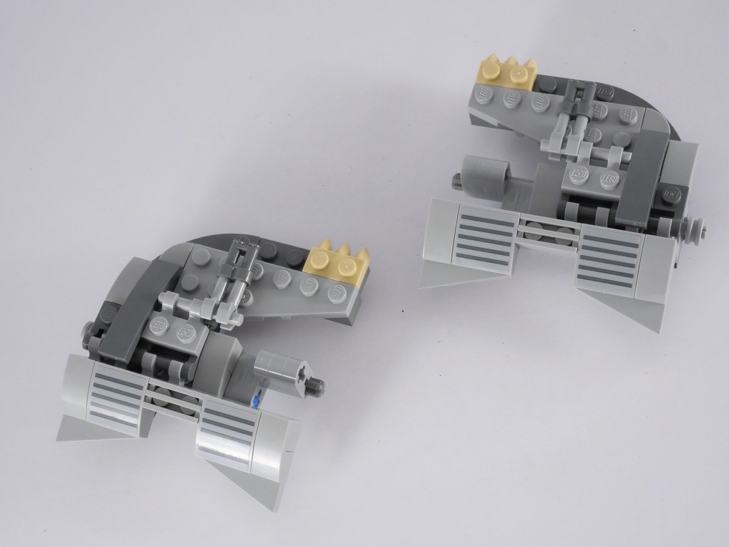 Cette partie supérieure du vaisseau est assemblée avec le cinquième sachet de pièces. Sa structure interne est composée de pièces Technic, que l’on vient par la suite habiller de slopes grises et vertes. On ajoute également les deux spring shooters, bien dissimulés une fois le modèle terminé. On termine cette étape avec l’ajout, dans le cockpit, du siège du pilote. Celui-ci est articulé sur un axe technic de manière à se positionner correctement selon la position du vaisseau, à plat ou vertical.