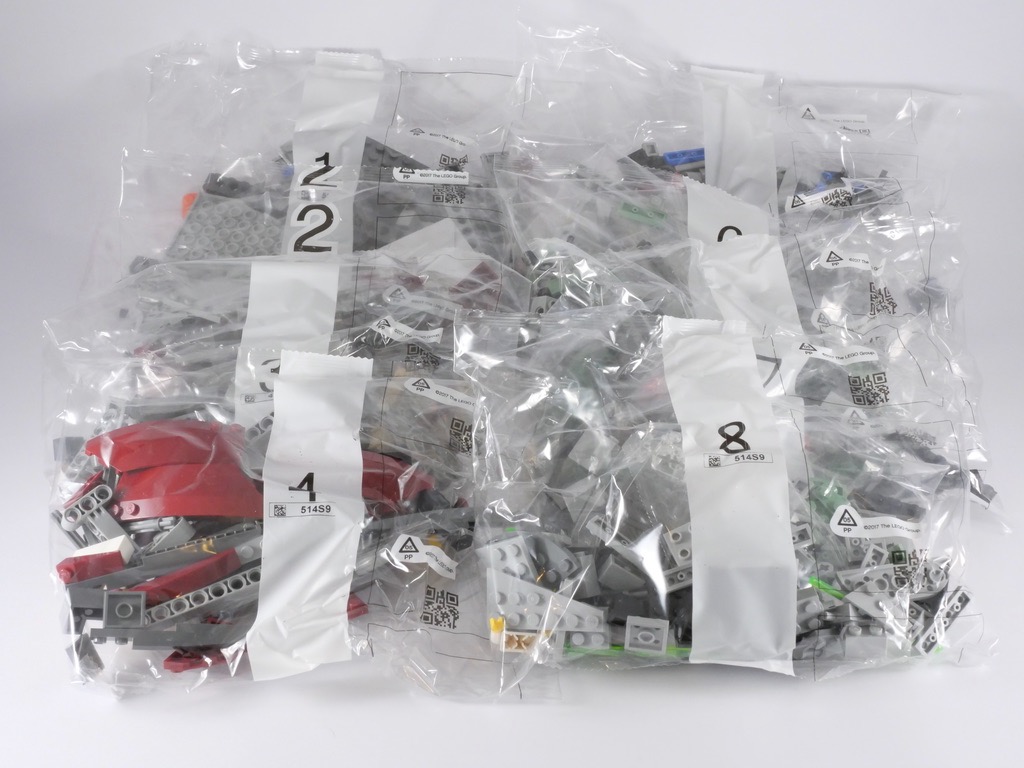 La construction est plutôt rapide, pour une raison simple : les 1007 pièces sont divisées en 8 sachets numérotés, chacun contenant donc en moyenne moins de 130 pièces. Toute phase de tri préalable est donc superflue, et on pourra s’atteler directement à la construction.