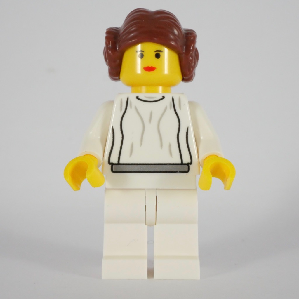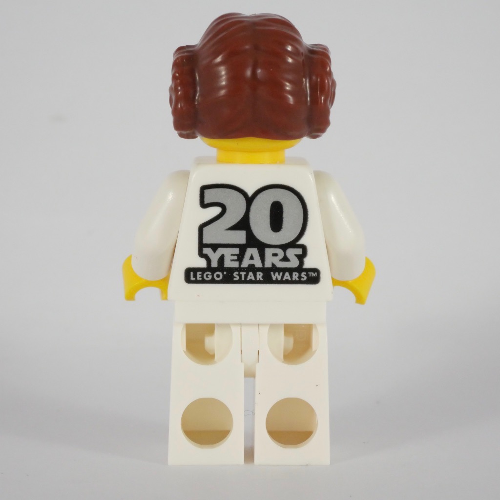 Comme tous les autres sets vendues à l’occasion de ce 20ème anniversaire, celui-ci contient une minifig collector, ici de la Princesse Leia. Pour une fois, ce n’est pas trop hors sujet. S’agissant d’une reproduction de la minifig vue en 2000 (dans le set 7190 – Millennium Falcon), elle est plutôt simple : des jambes blanches monochromes, un haut blanc avec quelques plis, un visage très simple avec un peu de rouge à lèvres et la fameuse coiffure de la princesse. On retrouve, dans son dos, le fameux logo commémorant le 20ème anniversaire de la gamme LEGO Star Wars. Elle est livrée avec son socle d’exposition arborant le même logo, et son nom.