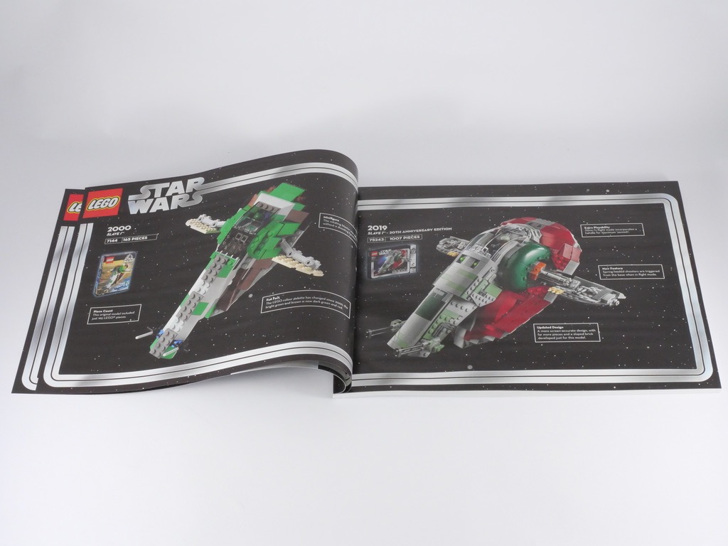 À l’intérieur, nous trouvons 8 sachets de pièces numérotés de 1 à 8, une planche de 10 autocollants et une notice d’instructions de 164 pages pour 265 étapes de construction. Celle-ci présente également, en introduction, le modèle « commémoré » avec cette boîte, ici la référence 7144 de 2000 et ses 165 pièces. On y retrouve également un récapitulatif des minifigs collector présentes dans les différentes boîtes, ainsi que quelques images de L’Empire Contre-Attaque.