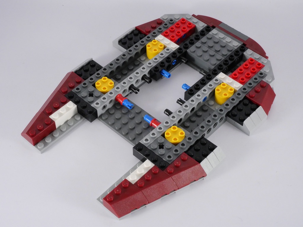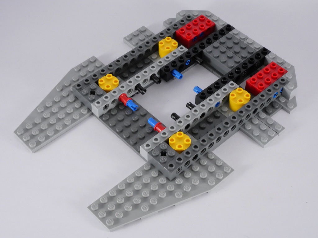Comme d’habitude avec ce type de modèle, la construction commence par la structure interne. Elle est composée, pour l’essentiel, de pièces Technic. Cette phase correspond au premier sachet de pièces, qui se termine par l’ajout de quelques plates qui commencent à donner au vaisseau sa forme caractéristique.