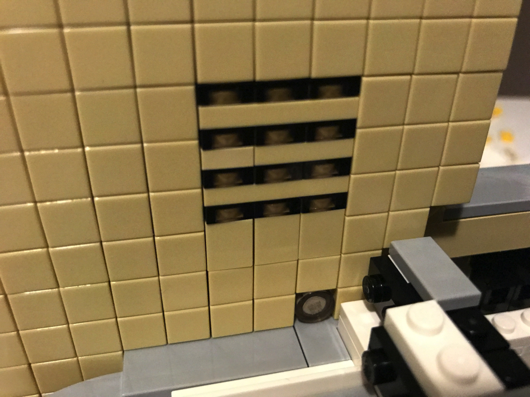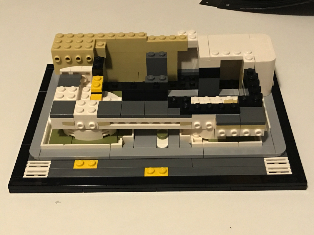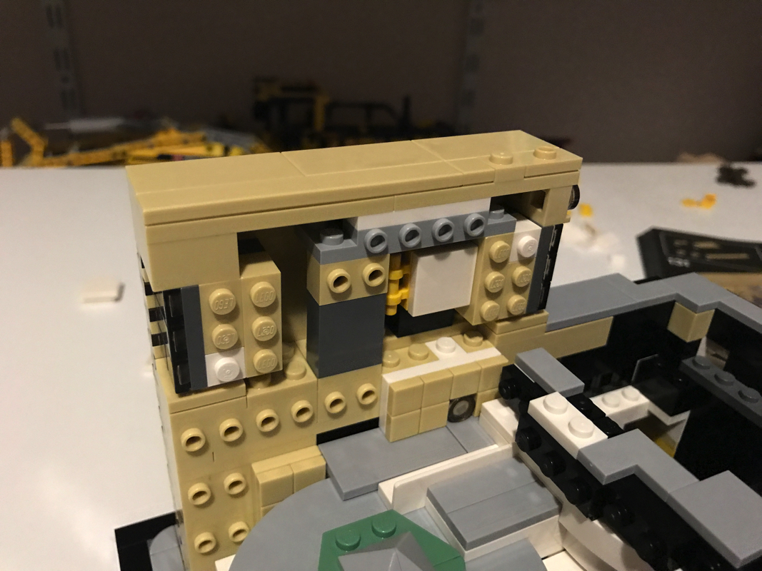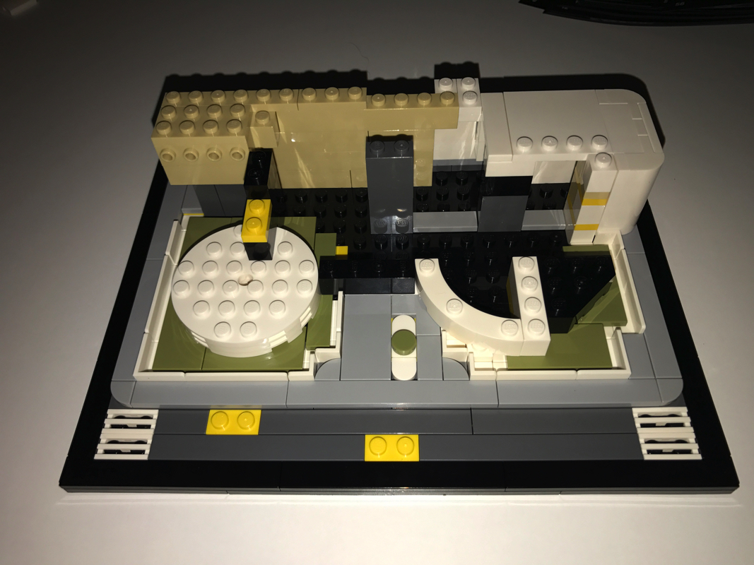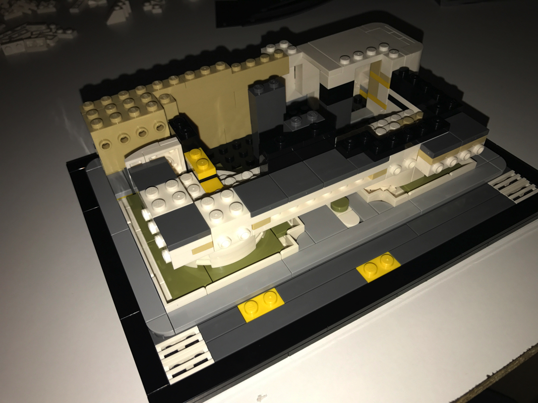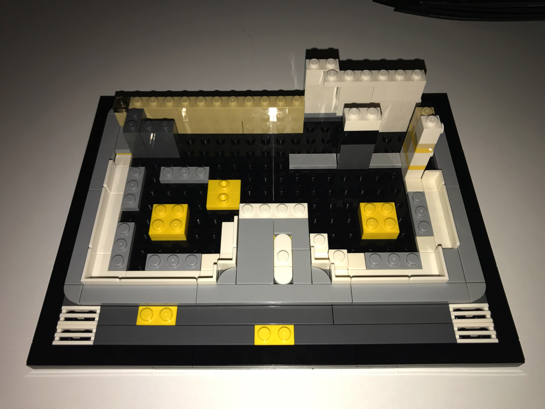 Le démarrage de la construction est assez classique et plutôt vu et revu dans la gamme Architecture : un assemblage de plates noires pour créer la base de notre modèle, le tour en tiles noires puis en dark bluish gray. Petite fantaisie à ce stade, un troisième « niveau » en light bluish gray vient s’ajouter au dessus, avec des coins arrondis plutôt jolis. Hormis les 2 plates jaunes sur l’avant du bâtiment, les autres pièces jaunes que l’on voit ici servent uniquement à faciliter la construction et seront masquées plus tard.