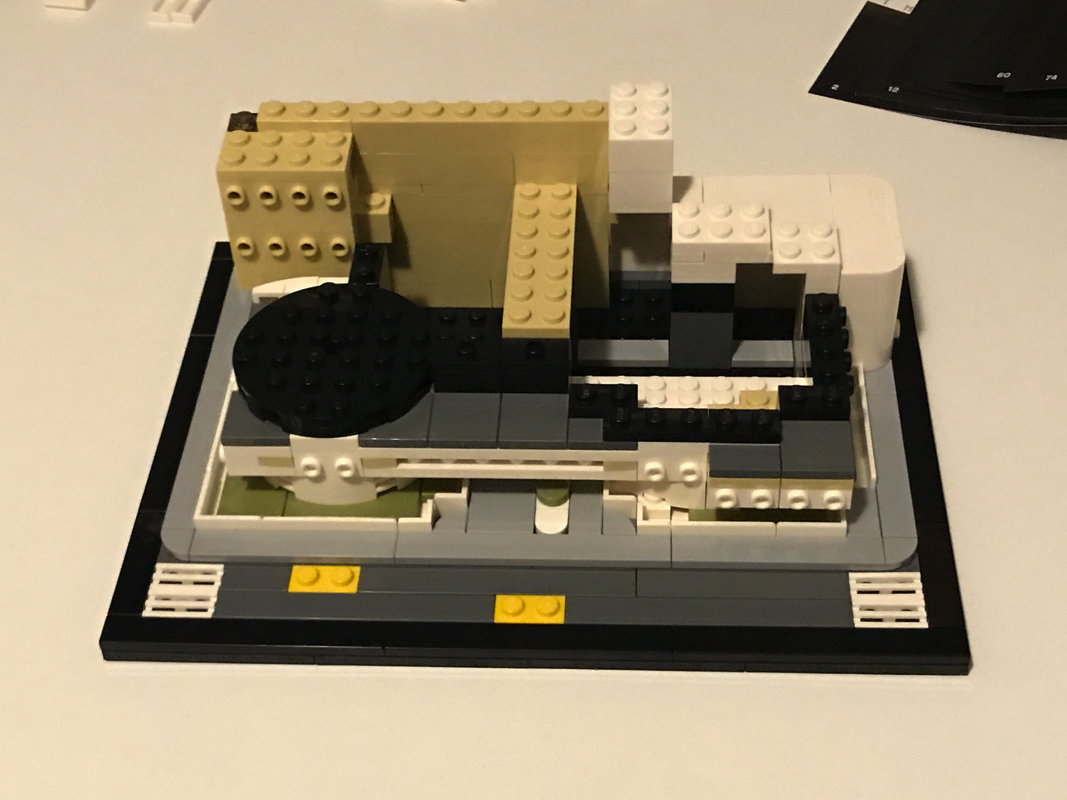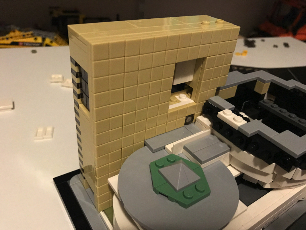 On continue la construction en assemblant la « coupole » principale, sans sa toiture dans un premier temps, qui vient par la superposition d’éléments circulaires de plus en plus larges représenter la forme de spirale caractéristique du bâtiment de Franck Lloyd Wright. On notera l’utilisation d’une nouvelle pièce ici dans les angles : 4 Black Brick, Modified 1 x 1 with Studs on 2 Sides, Adjacent sont de la partie. On assemble également la toiture de la partie basse du bâtiment.
