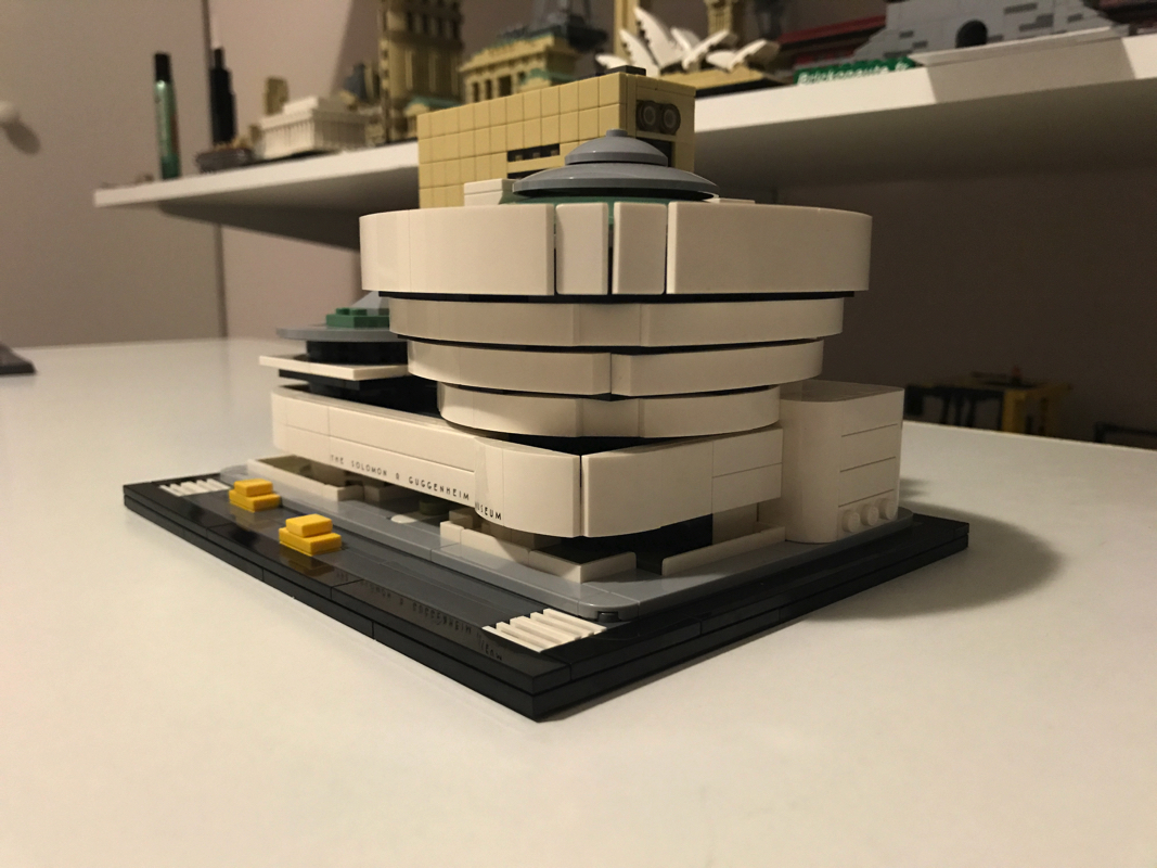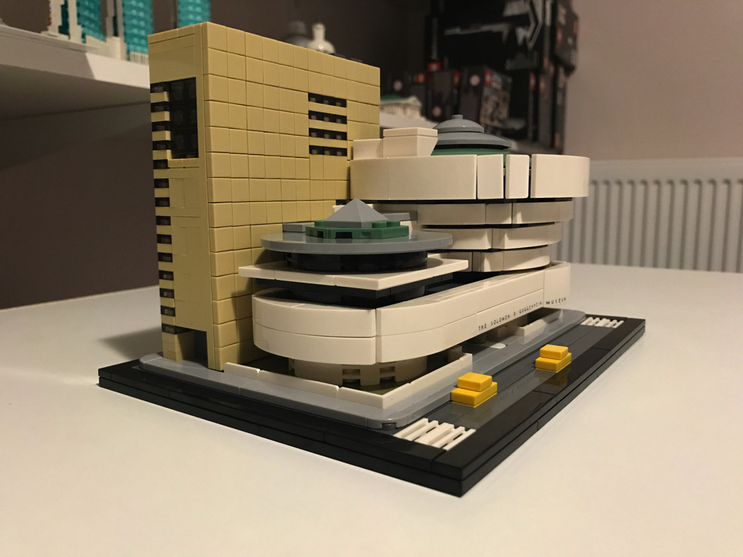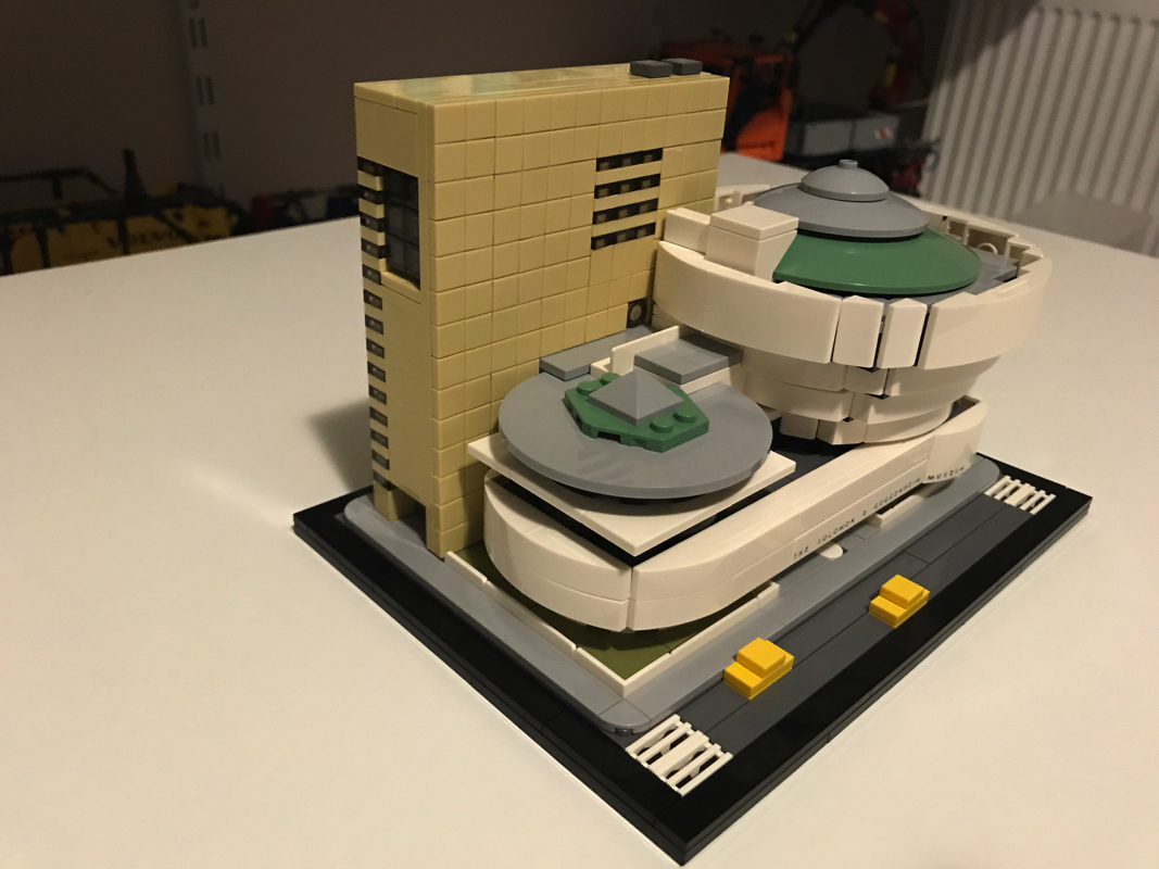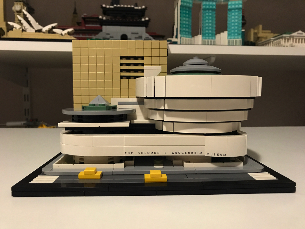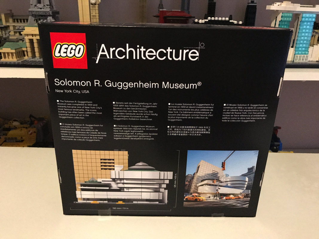 Le musée Solomon R. Guggenheim ou Solomon R. Guggenheim Museum est un musée d’art moderne situé sur la Cinquième avenue dans l’Upper East Side à New York, aux États-Unis. C’est le plus connu des différents musées créés par la fondation Solomon R. Guggenheim. Aussi il est souvent appelé simplement le Guggenheim. Il compte en 2005 environ 6 000 œuvres dont 3 % seulement sont exposées. Il a été dessiné par l’architecte de renom Franck Lloyd Wright, qui a eu droit à d’autres sets Lego (21005 – Fallingwater, 21010 – Robie House et 21017 – Imperial Hotel, aucun de ces trois sets n’est encore commercialisé par Lego aujourd’hui).