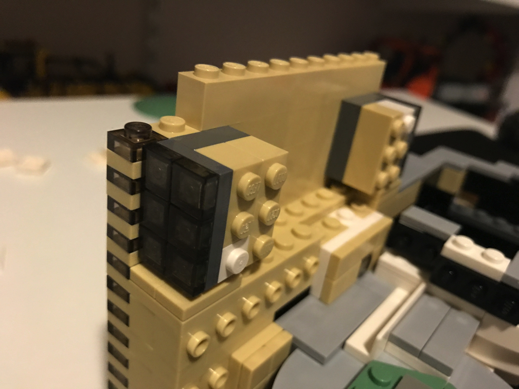 Vient ensuite l’assemblage de la partie « immeuble », qui malgré les passages plutôt rébarbatifs d’assemblages de tiles 1×1 constituant la façade, présente quelques passages intéressants en termes d’astuces de construction, notamment par la partie vitrée qui vient prendre place dans l’ossature du bâtiment à l’aide d’un clip. Il n’est jamais très facile d’aligner parfaitement les tiles 1×1, néanmoins le fait qu’elles prennent place sur des plates que l’on vient rapporter ensuite sur le bâtiment facilite quelque peu l’opération.