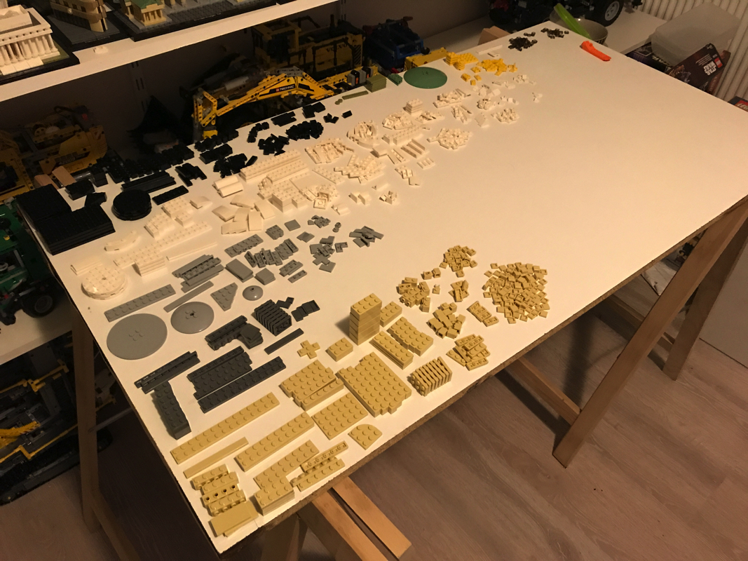 A l’ouverture de la boîte, on trouve 7 sachets de pièces, dont 2 qui en contiennent un plus petit, non numérotés. Le tri des pièces s’avère assez fastidieux tant l’inventaire est riche pour un set de cette taille en termes de variété de pièces. Premier élément marquant de ce set : l’habituelle tile sur laquelle on retrouve le nom du bâtiment sur l’ensemble des autres sets ou presque n’existe pas, et est remplacée pour mieux coller à la réalité par une tile et une slope blanche qui viennent sur le bâtiment. Quelques nouveautés notables aussi comme une grande Sand Green Dish 10 x 10 Inverted (Radar) – Solid Studs qui nous servira pour le toit du bâtiment ou encore 4 Black Plate, Round 6 x 6 with Hole.