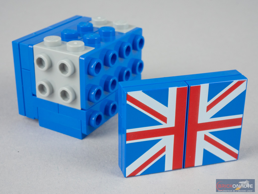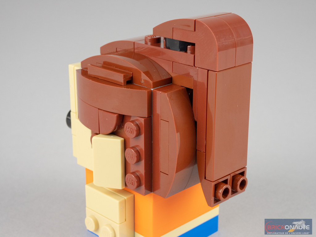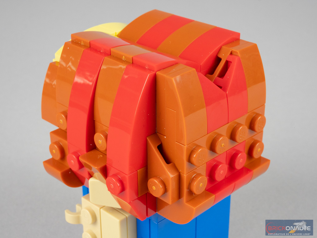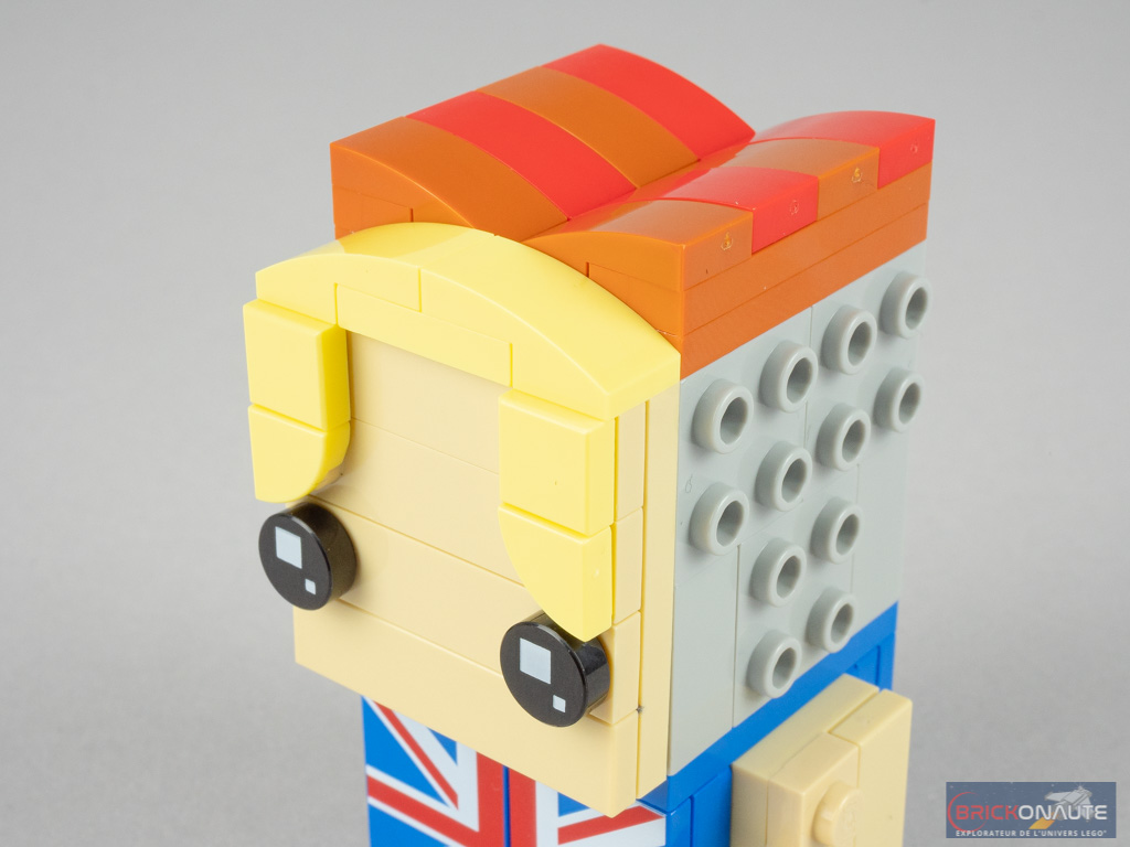 La construction de Geri est moins conventionnelle, à commencer par le torse où les deux tiles tampographiées de l’Union Jack sont fixées sur des éléments SNOT solidaires de la structure. La coiffure est également très sympa avec une jolie alternance d’éléments dark orange et rouges.