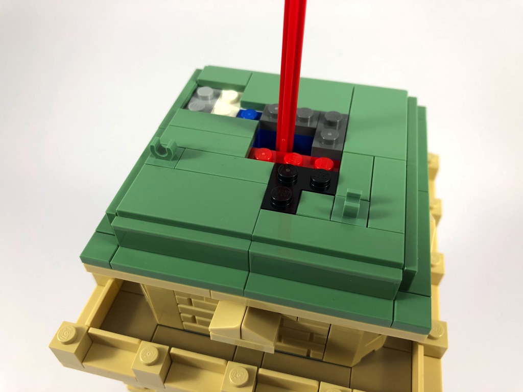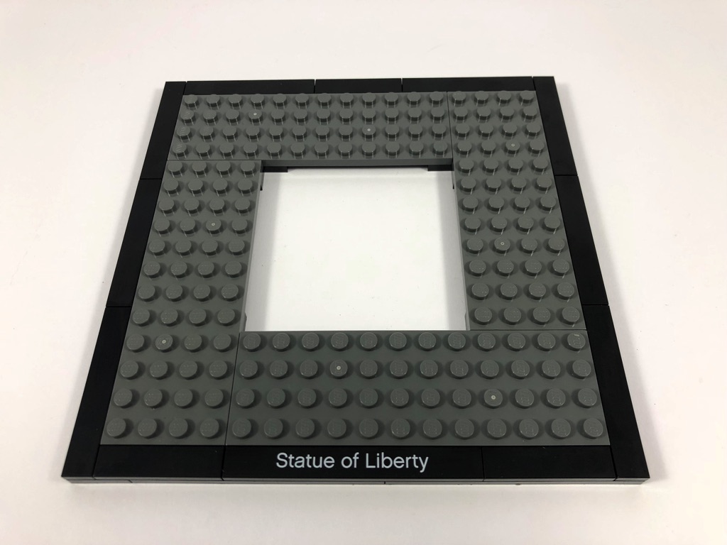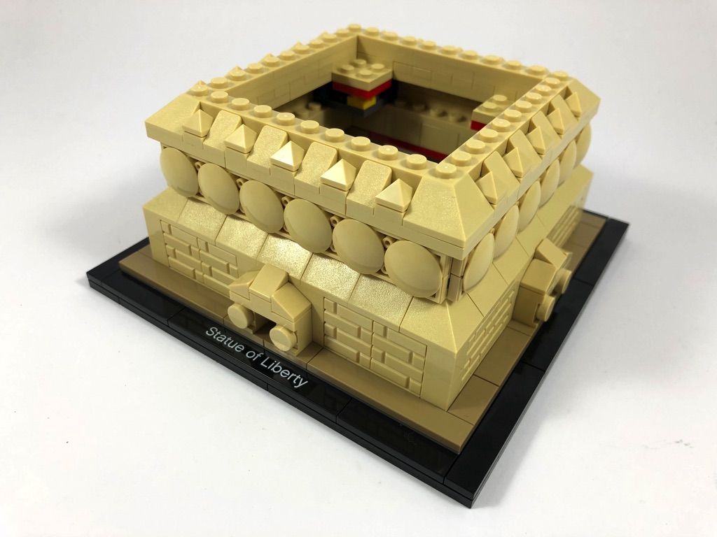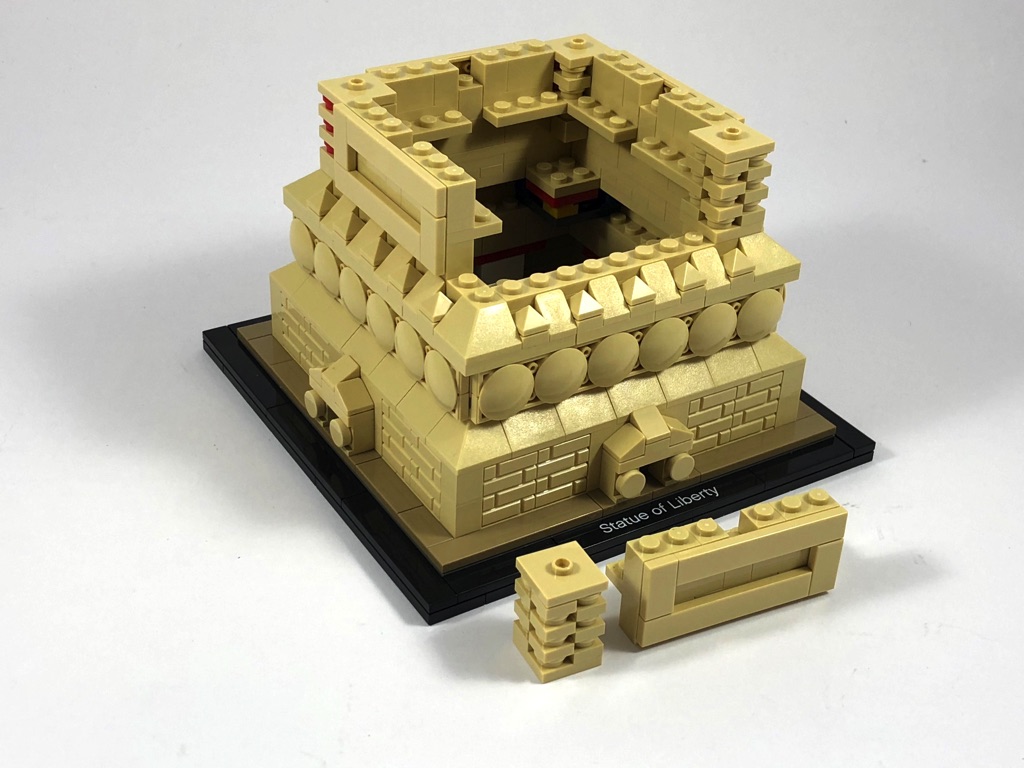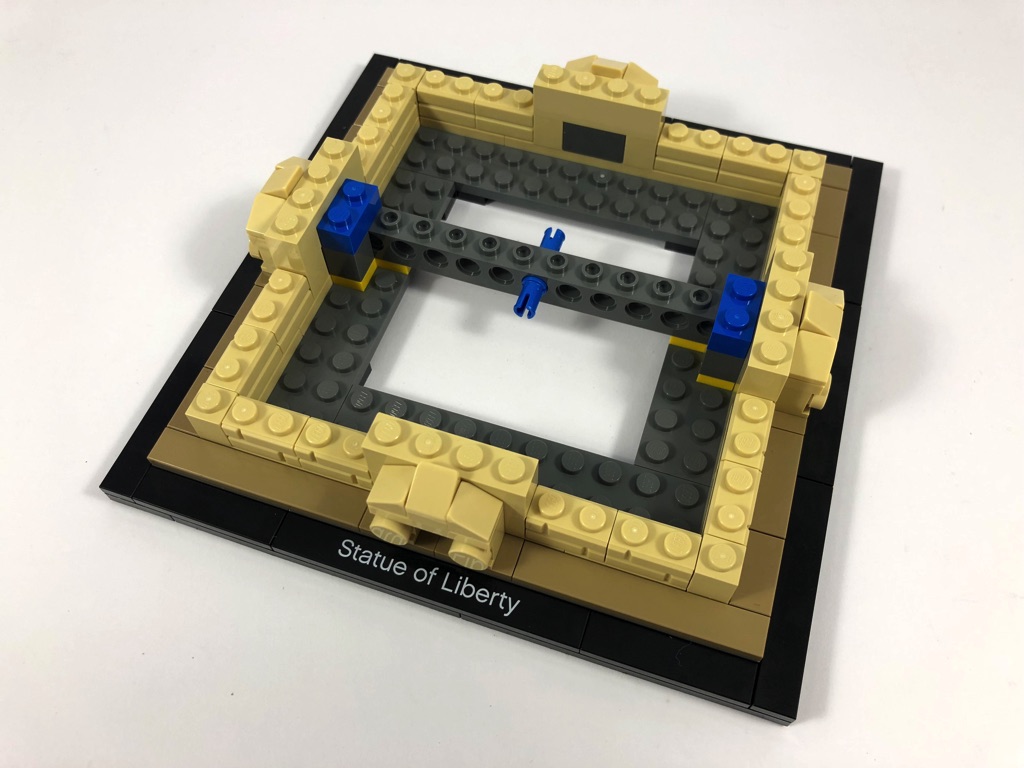 Vous vous en doutez, la construction démarre par le socle d’exposition, où l’on retrouve la tile tampographiée « Statue of Liberty ». On commence alors le piédestal, qui se constitue dans sa partie basse de briques texturées. On notera le travail apporté aux portes situées sur les 4 côtés. Une brique Technic et un pin sont laissés en attente à l’intérieur.