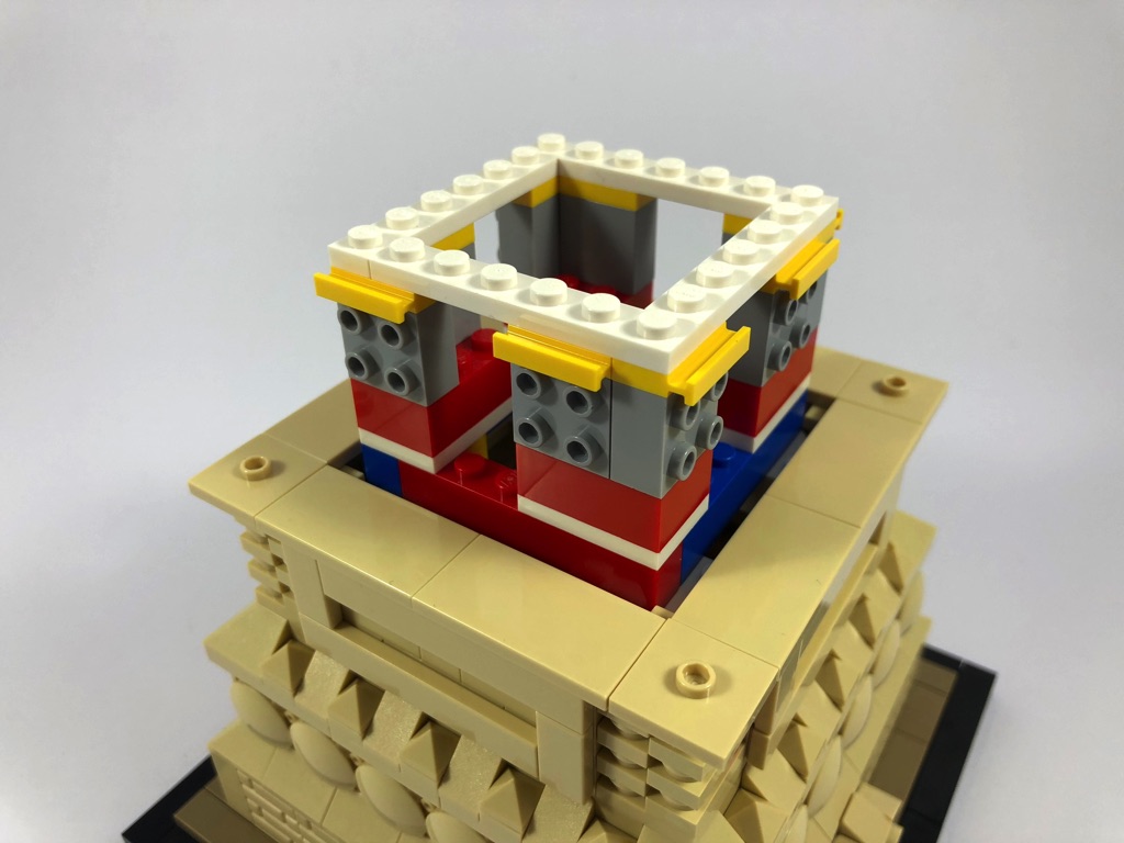 Après l’ajout d’un « couronnement » au-dessus des pièces situées sur chacune des faces, nous avons droit à « l’étape de la mort » : les 4 piliers maçonnés sont à construire, chacun étant constitué de 33 pièces, pour un total (sur une seule étape) de 132 pièces à ajouter au modèle.