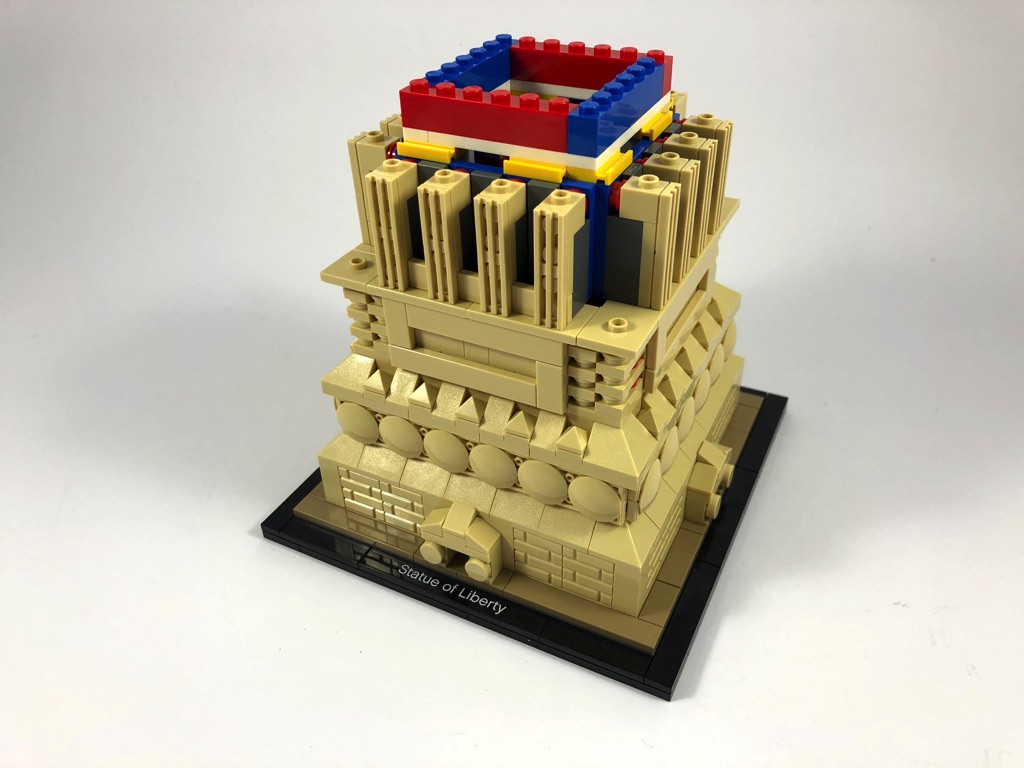 La version précédente (le set 3450) date de près de 20 ans, et LEGO avait alors choisi de représenter la Statue sans son socle et présentant des tenons apparents. Aujourd’hui, le parti pris est différent. Nous avons droit à un socle ultra-détaillé, et à une statue toute lisse représentée avec les nouvelles pièces à la disposition du designer.