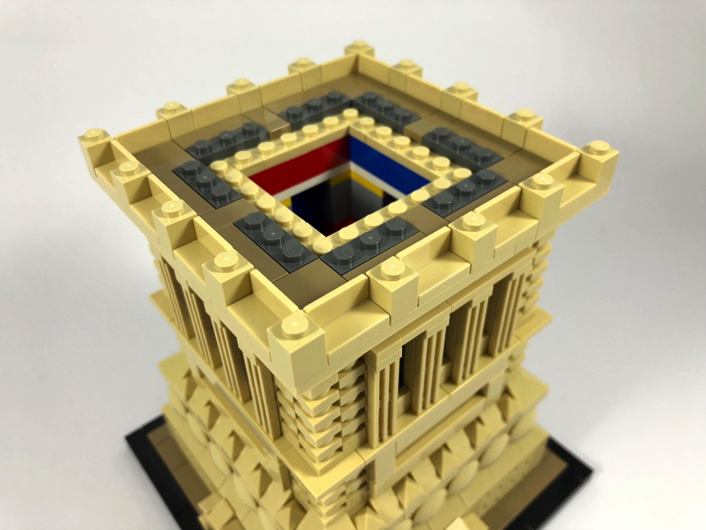 Ces 4 piliers construits, on continue avec un cadre qui servira de support à l’étage supérieur. Les quatre portes menant à cet étage sont ajoutées, on notera que l’assemblage qui les surplombe est fixé à l’aide de clips à la structure. Un assemblage de 3 axes Technic relie la base de la statue à cette dernière. Les murs, et le futur support de la statue terminent cette troisième série de sachets et par là-même le socle de la statue. Une quarantaine de minutes suffit à terminer cette série.