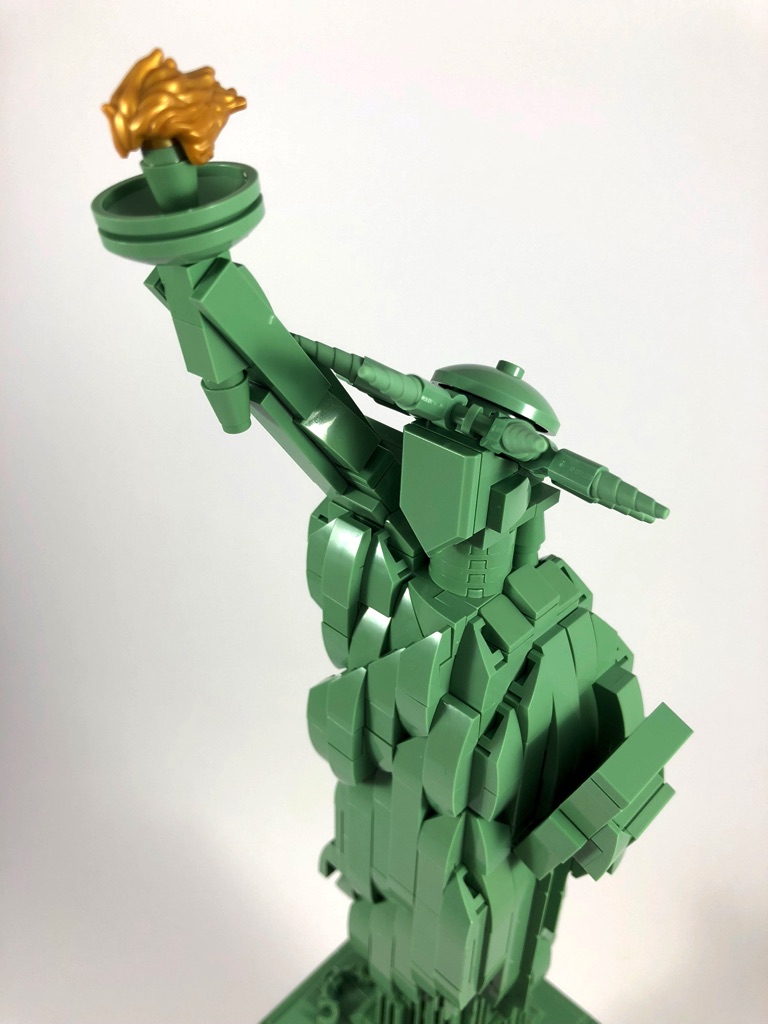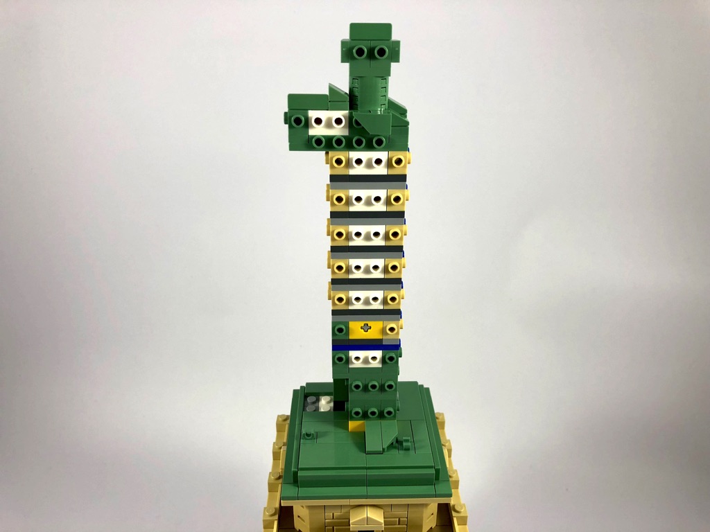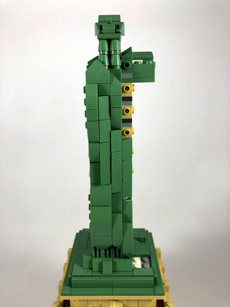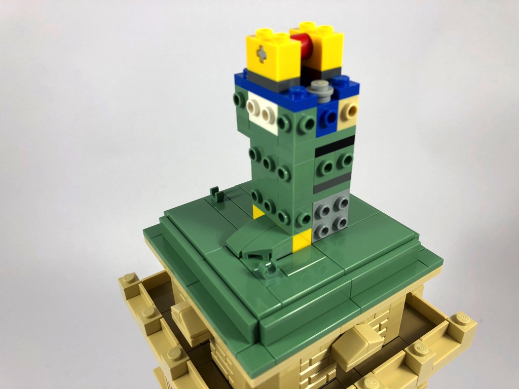 La construction de la Statue est dans l’ensemble plutôt simple. Il s’agit d’une structure composée de briques SNOT couverte de tiles et slopes pour la toge de la statue. Quelques éléments rapportés amènent un peu de « fantaisie » dans la construction, comme la flamme, le livre ou encore la jambe droite. Le design est dans l’ensemble plutôt réussi, les plis de la toge étant représentés par des slopes biaises s’enfonçant dans la toge, alignées entre elles.