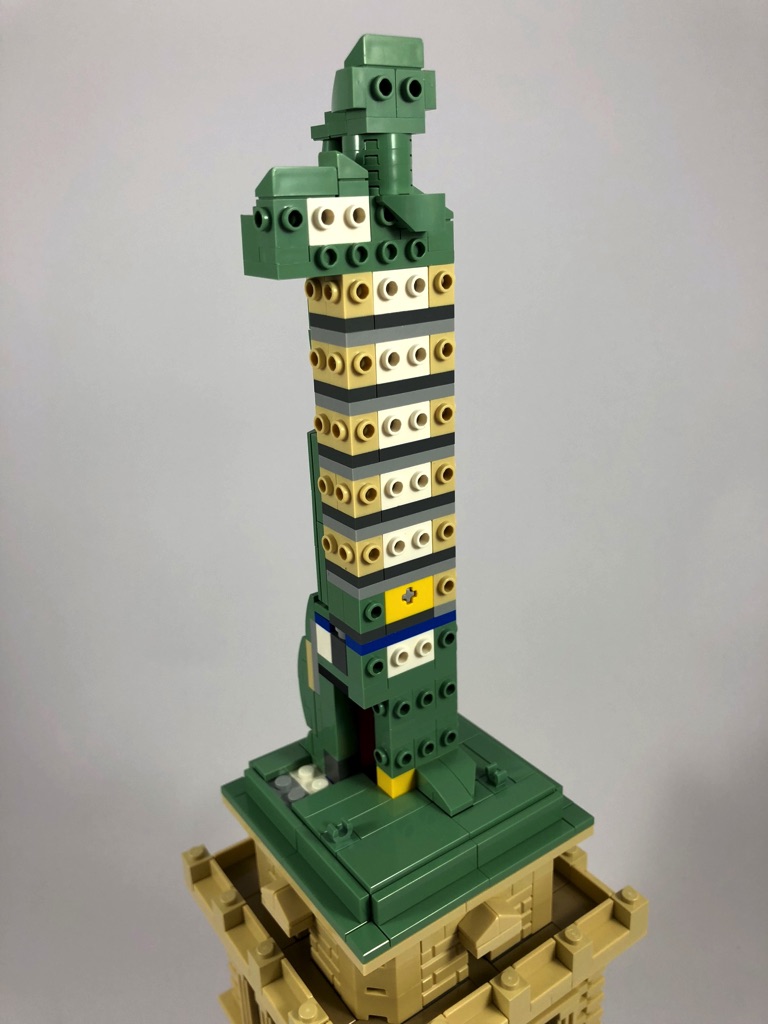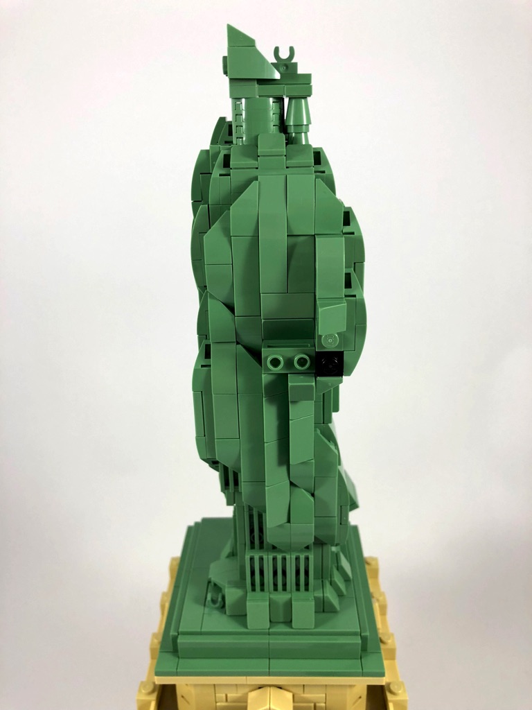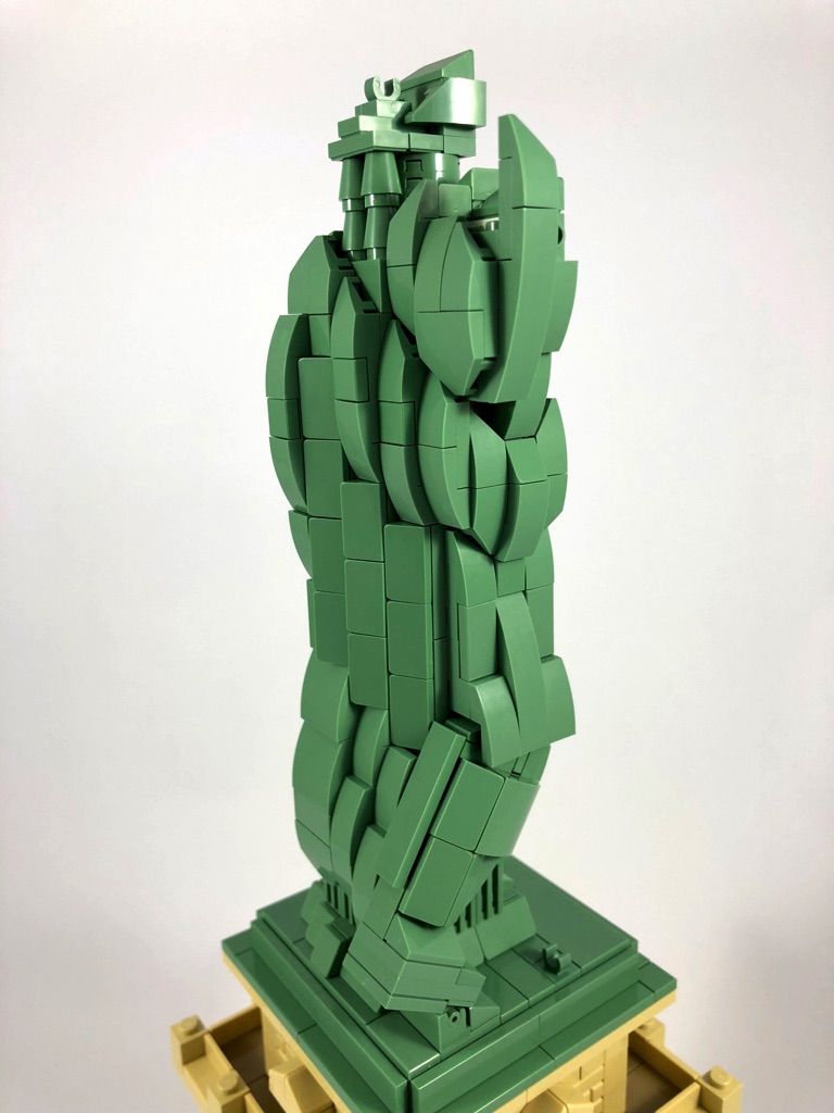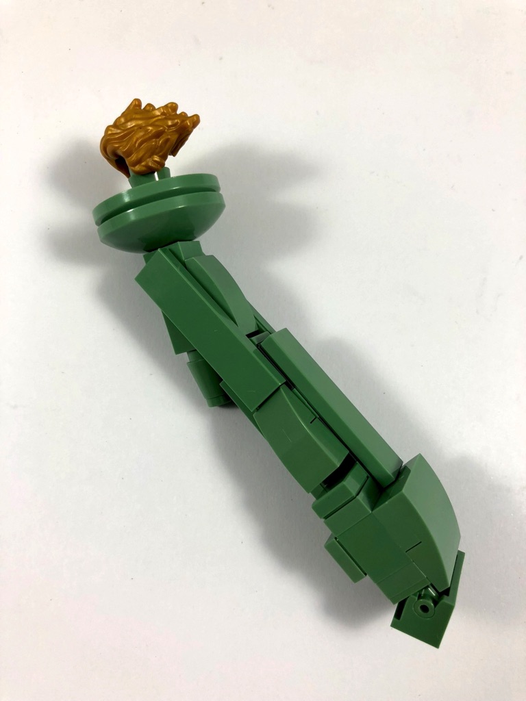 La construction de la Statue est dans l’ensemble plutôt simple. Il s’agit d’une structure composée de briques SNOT couverte de tiles et slopes pour la toge de la statue. Quelques éléments rapportés amènent un peu de « fantaisie » dans la construction, comme la flamme, le livre ou encore la jambe droite. Le design est dans l’ensemble plutôt réussi, les plis de la toge étant représentés par des slopes biaises s’enfonçant dans la toge, alignées entre elles.