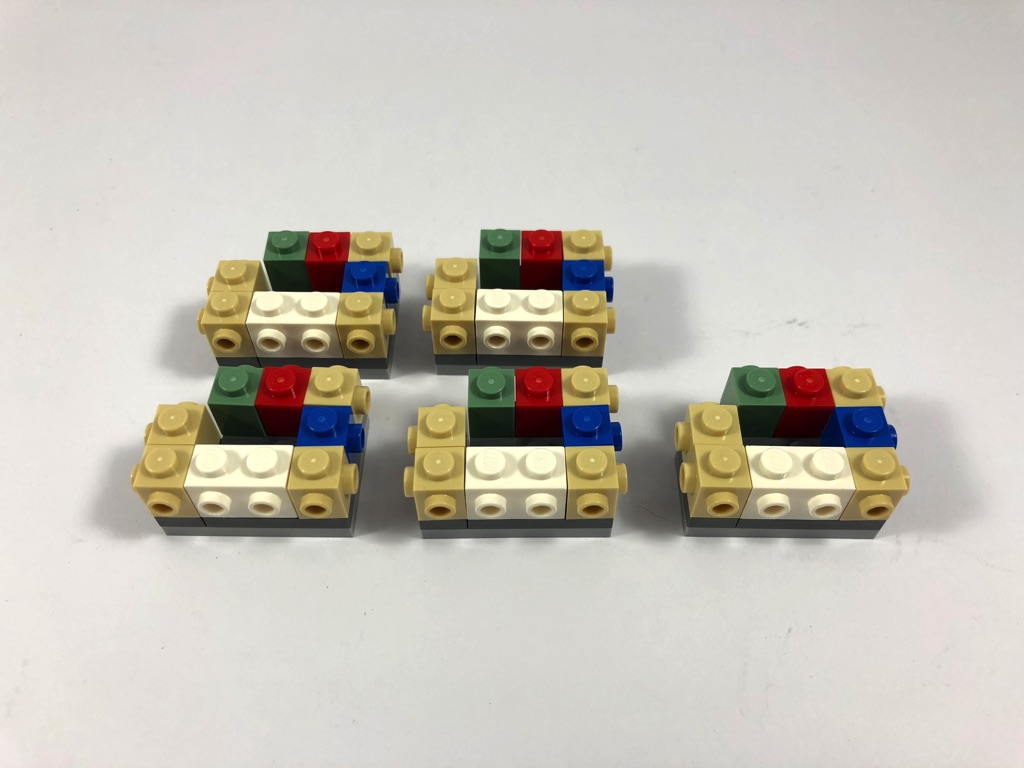 Si vous croyiez (comme moi) en avoir fini avec les étapes répétitives, il n’en est rien. la structure interne de la statue est en effet constituée de 5 sous-assemblages identiques superposés. Nous obtenons ainsi une structure essentiellement composée de briques SNOT, que l’on va ensuite habiller. Mais avant cela, on construit les deux épaules, le cou et une partie de la tête de la statue.