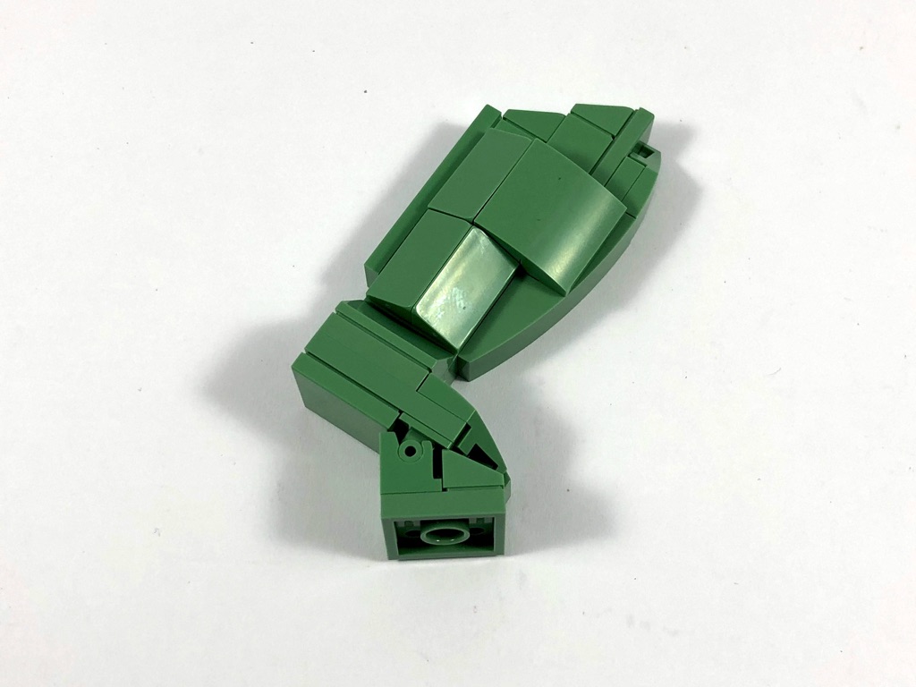 On reproduit le même schéma sur l’avant, et sur le côté droit de la statue : des sous-assemblages constituées de plates surmontées de slopes formant – par leur juxtaposition – les plis de la toge, sont ajoutés sur la structure de la statue.