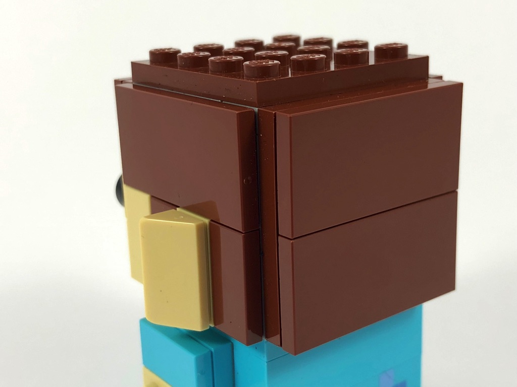 La construction de Steve est d’un ennui mortel. Elle suit le schéma « classique » de la gamme LEGO BrickHeadz, sans jamais en déroger. On commence par le torse, puis les bras, avant de construire la structure de la tête et d’habiller les différentes faces de celle-ci. Aucune technique intéressante à se mettre sous la dent. On termine en ajoutant les deux jambes, puis en posant Steve sur son socle.