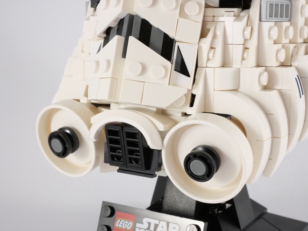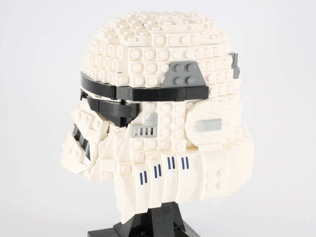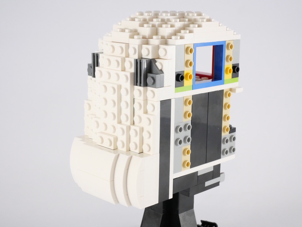 Pour le reste, c’est encore une fois pas mal du tout. Si les conduits latéraux et leur aspect « d’escalier » peuvent choquer au premier regard, c’est sans doute la meilleure solution que le designer avait à adopter. Concernant ces conduits, je regrette simplement la partie centrale où apparaissent 4 tenons alors que tout le reste est lisse, ça manque de cohérence. Là encore, le parti pris de tous ces tenons visibles plaira à certains et moins à d’autres. On est ici clairement en présence d’un produit LEGO, qui doit s’identifier comme tel au premier coup d’oeil. De nombreuses marques proposent de véritables « maquettes » de ces casques, et de toute façon au regard de l’échelle retenue ce n’est ici pas le cas.