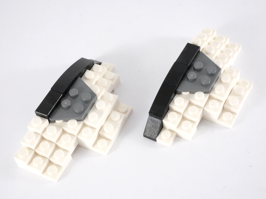 On continue avec le côté gauche, constitué d’un énorme sous-assemblage qui concernera la totalité du 4ème sachet de pièces. Celui-ci est basé sur une plate de 4×12 tenons, qu’on agrémente ensuite avec les capteurs auditifs et les deux conduits latéraux. Ceux-ci sont constitués de slopes décalées les unes par rapport aux autres, il en résulte un effet d’escalier mais il était difficile de faire autrement. Remarquez encore les stickes « plus blanc que blanc » qui représentent les filtres de sortie.