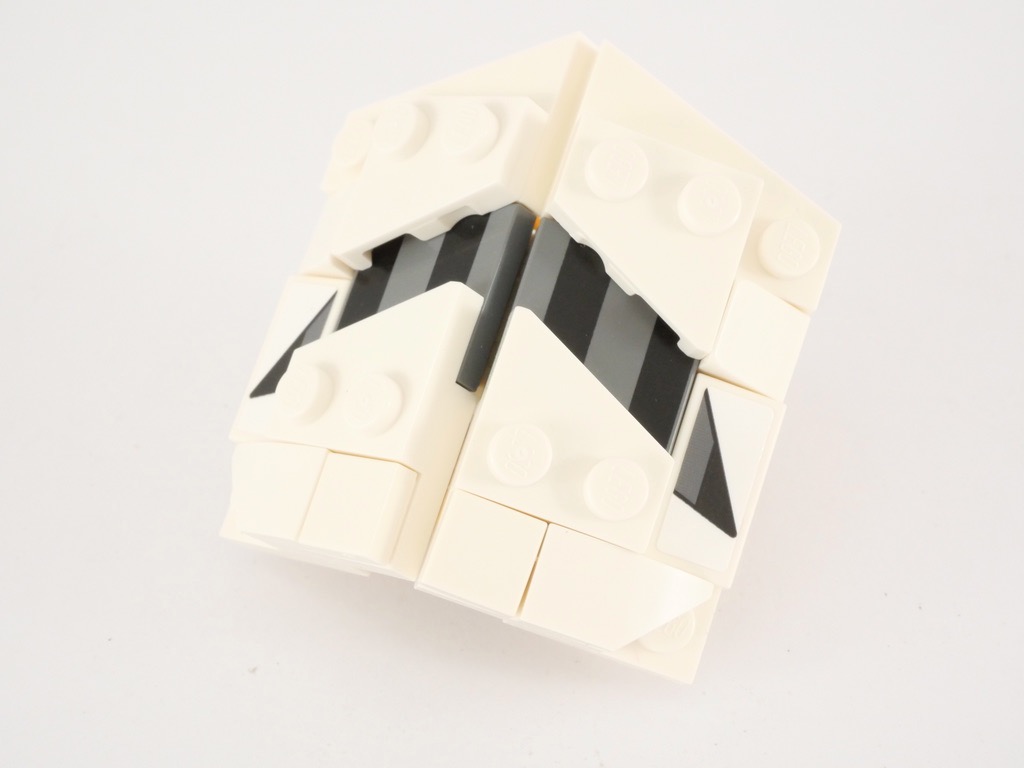 Dans l’étape suivante, nous nous intéressons à la face avec pour commencer un premier assemblage et sa bande noire caractéristique que l’on fixe au niveau du front. Deux autres sous-assemblages, identiques à la symétrie près, prennent place sur les deux côtés. Nous continuons avec les yeux, clipsés sur le « front », puis la bouche. Ici, deux petits assemblages sont fixés sur des charnières de manière à obtenir cette forme pointue. Si les deux pièces grises en dessous sont tampographiées, ce n’est pas le cas des pièces blanches sur lesquelles nous devons coller un sticker.