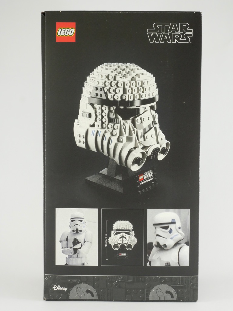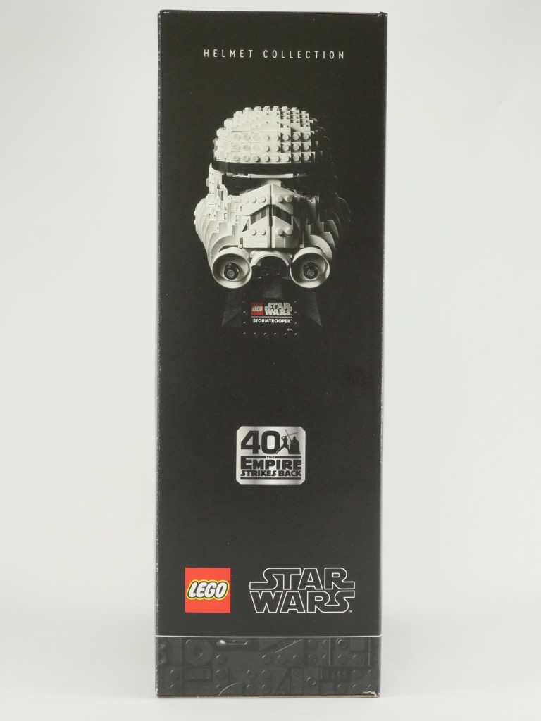 SI vous avez déjà lu mon test du set 75277 Boba Fett Helmet, je vais me répéter un peu puisque les deux boîtes sont similaires. On retrouve cette même finition soignée avec vernis sélectif pour le casque, et la mention « 18+ » qui nous indique clairement le public visé par ce produit. Le casque est présenté de trois quarts sur la face avant, sur son socle avec la plate tampographiée. On retrouve le casque vu de face sur le côté de la boîte, au-dessus du logo des 40 ans de L’Empire Contre-Attaque. Une troisième image du set est présente au dos de la boîte, au-dessus d’une autre nous précisant ses dimensions (18cm avec le socle) et de deux photos du casque tel qu’on le voit dans les films.