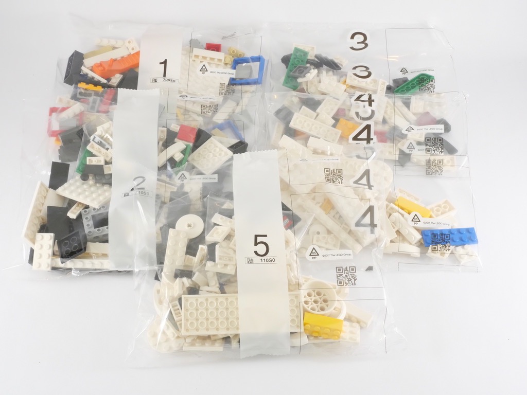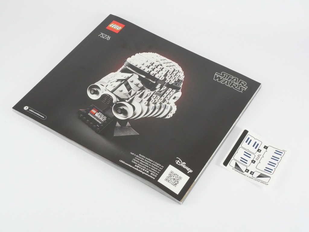 A l’intérieur, nous trouvons 5 sachets de pièces numérotés qui remplissent un peu plus la boîte que pour le casque de Boba Fett. Nous trouvons également une notice d’instructions (124 pages / 231 étapes) et, mauvaise surprise, une planche d’autocollants. Pas de pièces rare à mentionner dans l’inventaire, si ce n’est la plate et les deux tiles tampographiées.