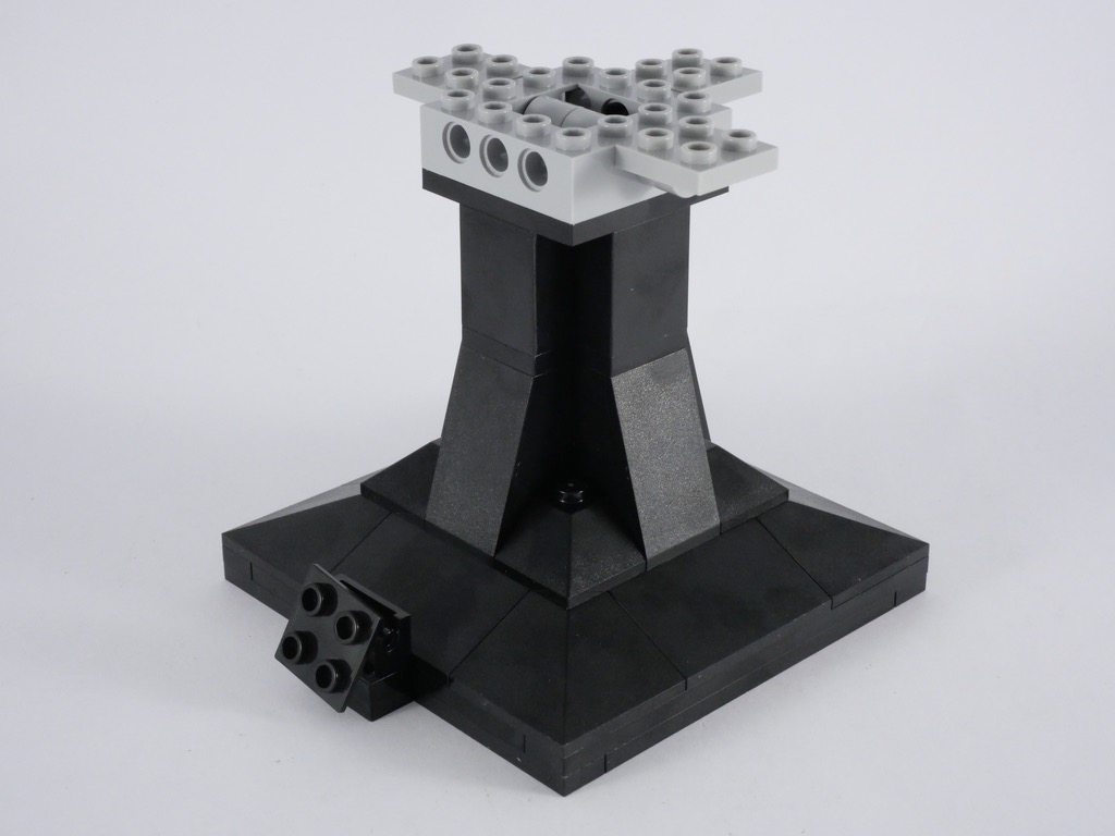 Nous construisons alors le socle d’exposition. Il est identique en tous points à celui de Boba Fett, la structure interne étant renforcée par des beams Technic et l’extérieur décoré de différentes slopes noires. Et le résultat est très satisfaisant. On fixe ce support au casque, avant d’en décorer la partie inférieure et d’y fixer notamment les ball joints sur lesquels seront attachés les filtres. Nous terminons cette étape avec deux sous-ensembles, qu’on attache à l’arrière du casque.