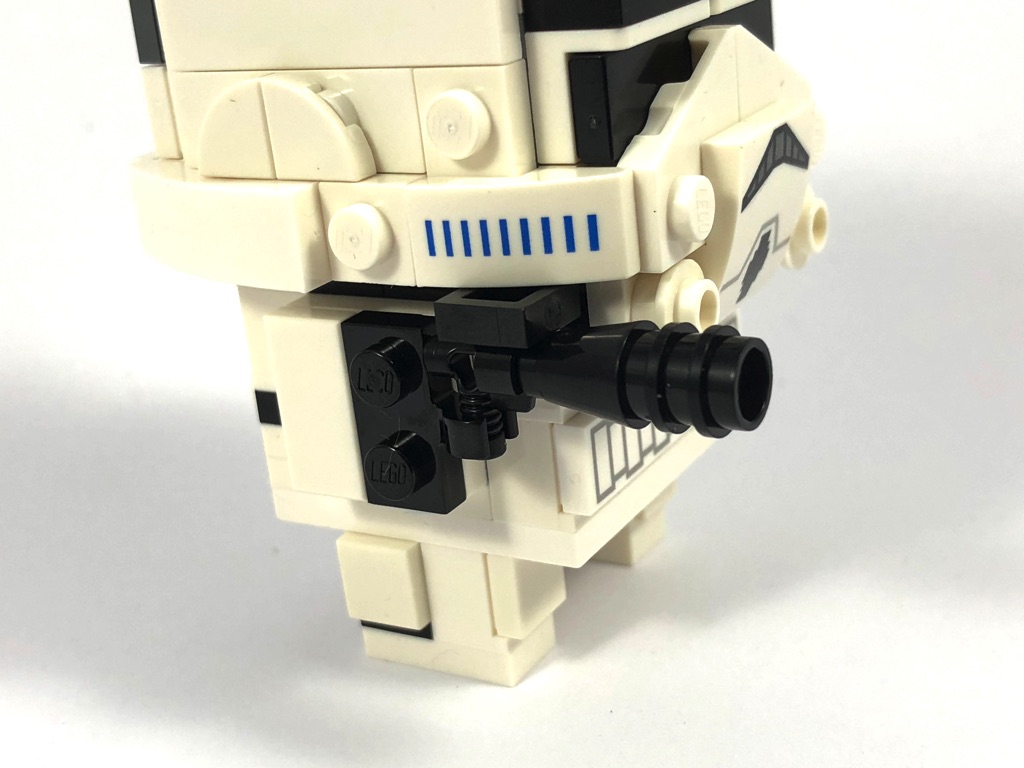 Après les deux dernières reviews LEGO BrickHeadz consacrées aux deux boîtes issues de La Reine des Neiges (41617 – Elsa et 41618 – Anna & Olaf), nous revenons à quelque chose de plus classique avec ce Stormtrooper. Nous commençons par son torse, avec la ceinture porte-outils réalisée de la même manière que Finn (une Plate, Modified 1 x 1 with Clip Light – Thick Ring, fixée sur un jumper). Une tile tampographiée décore la partie avant de cette ceinture. Les bras se composent des 3 pièces habituelles.
