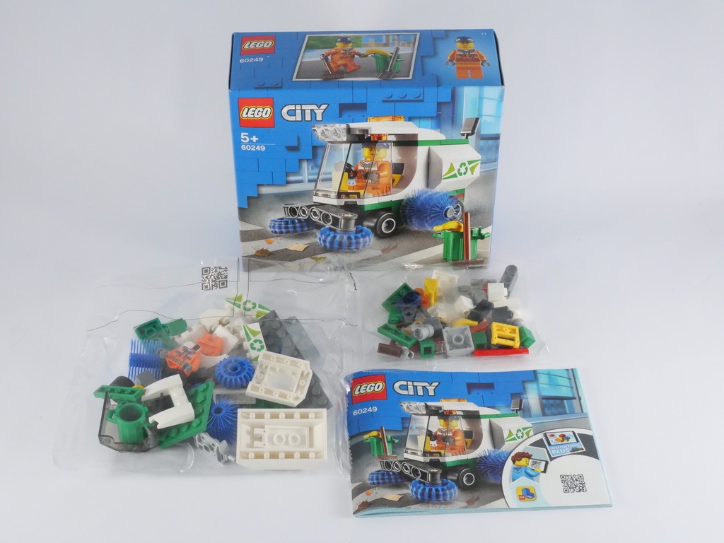 Dans la petite boîte mettant en scène notre balayeur aux commandes de son engin dans les rues de sa ville, nous trouvons deux sachets de pièces et une notice d’instructions de 48 pages. Pas d’autocollant ici : les deux briques avec le sigle « recyclable » vert sont tampographiées. On notera également la présence de deux brosses bleues, présentes dans un seul autre set (la référence LEGO Friends 41350 Spinning Brushes Car Wash, sortie en 2018).