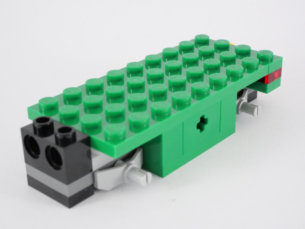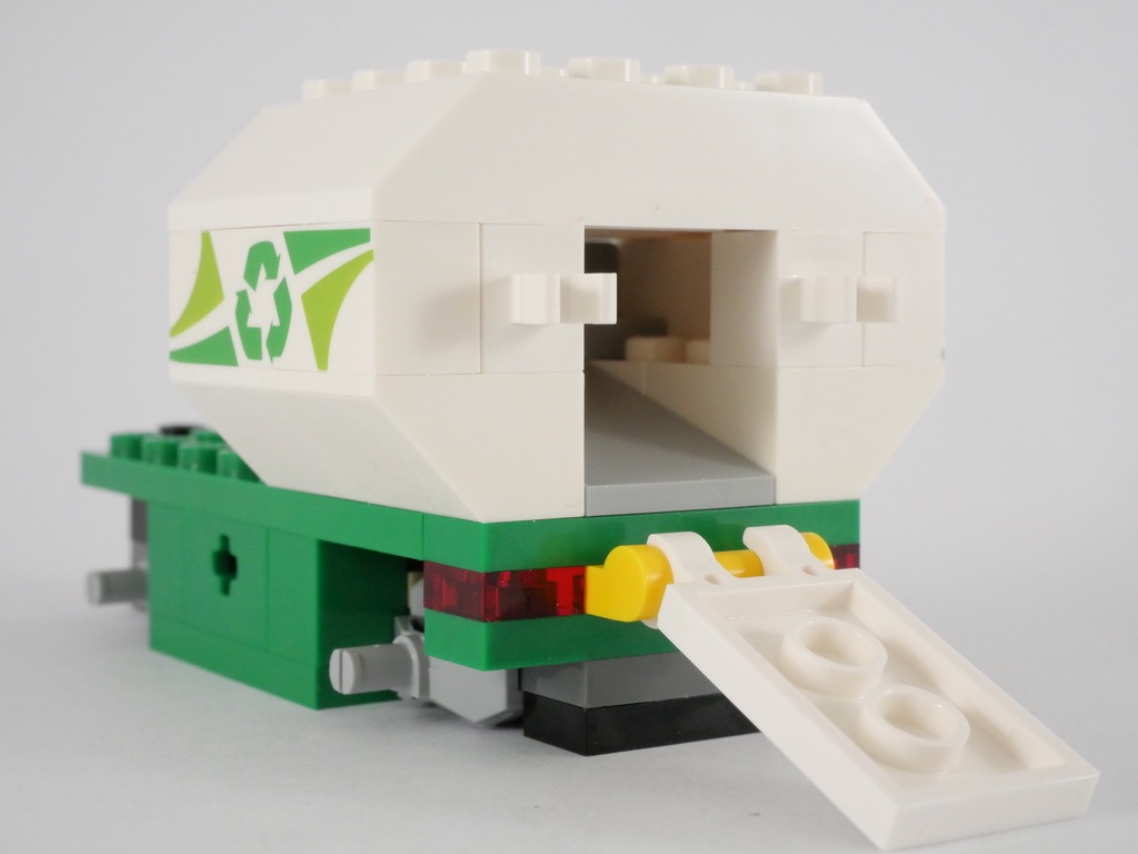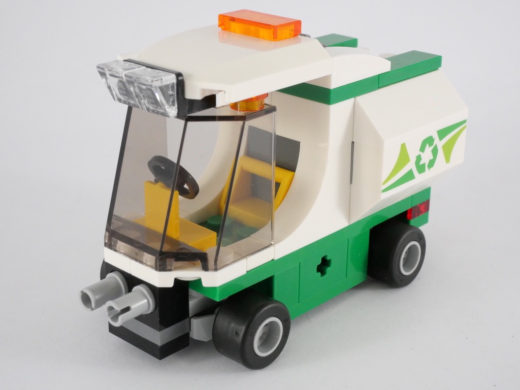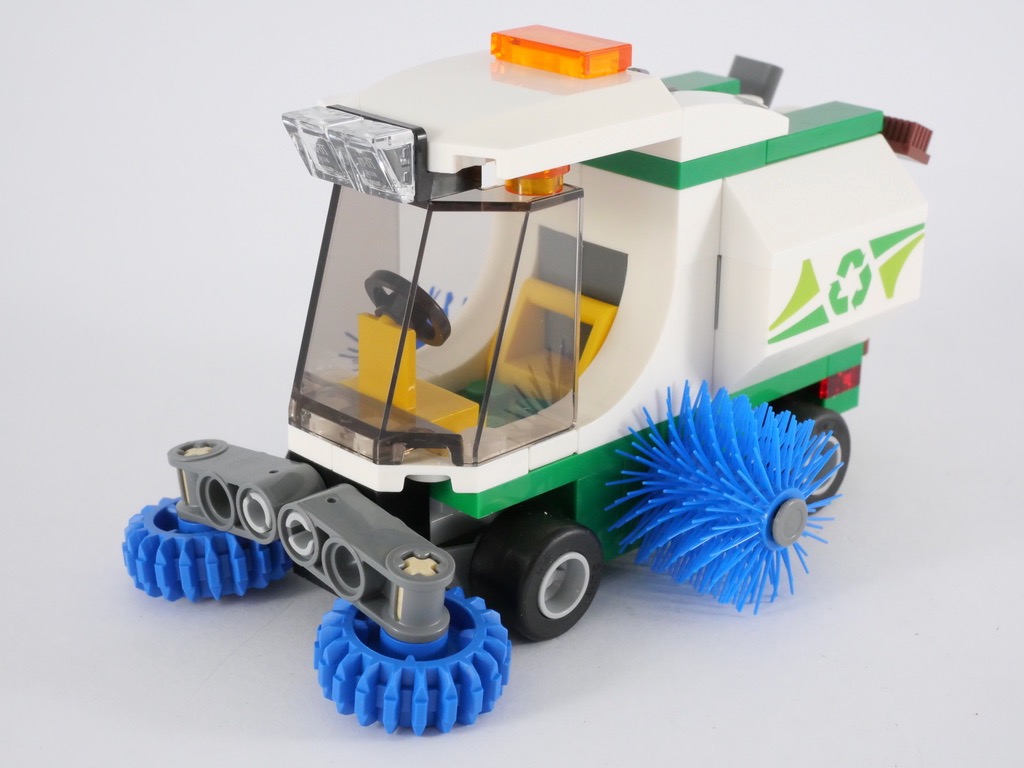 La construction reste très logique : on commence par le châssis (notez les feux arrière brick built), la partie arrière avec la benne à déchets et sa trappe, le poste de commande avec son volant, pour terminer par les roues et les éléments permettant de nettoyer : deux brosses sur le côté, et deux engrenages Technic sur l’avant. Choses très intéressante, les brosses touchent le sol une fois la machine posée : elles tournent donc lorsqu’on la fait avancer ! Le système de fixation des brosses avant est pour ce point vraiment malin.