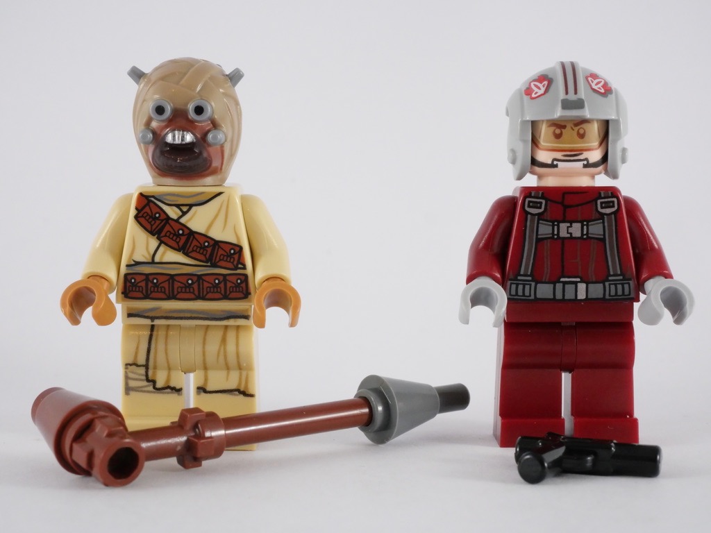 Il manquait peu de choses pour que les deux minifigs soient irréprochables : juste une petite tampographie du pantalon du pilote. Pour le reste, je ne trouve rien à redire de ces deux belles minifigs, superbement réalisées. Tout y est très détaillé et, cerise sur le gâteau, le pilote est exclusif à cette boîte (et le Tusken Raider n’est présent que dans une seule autre référence).