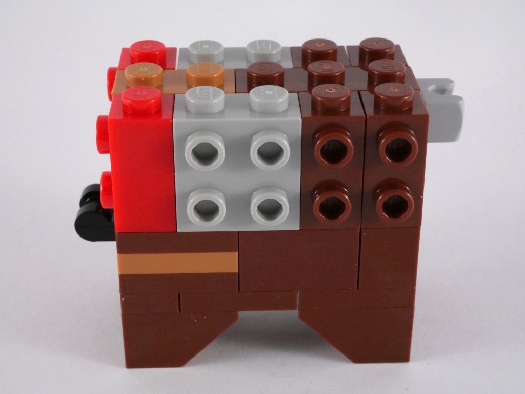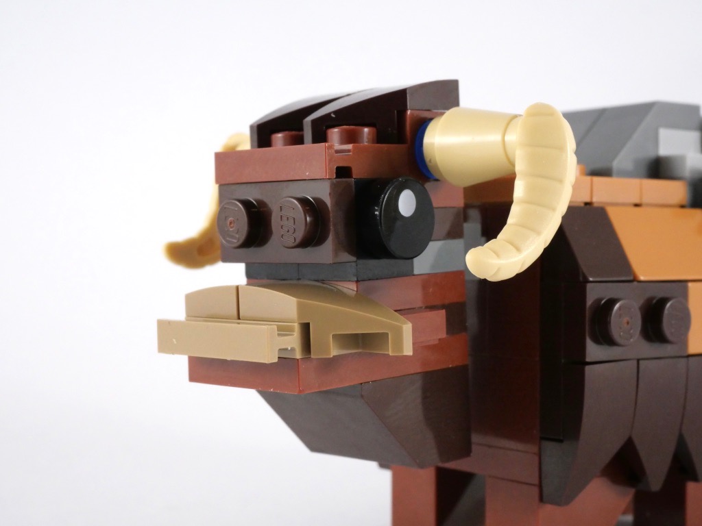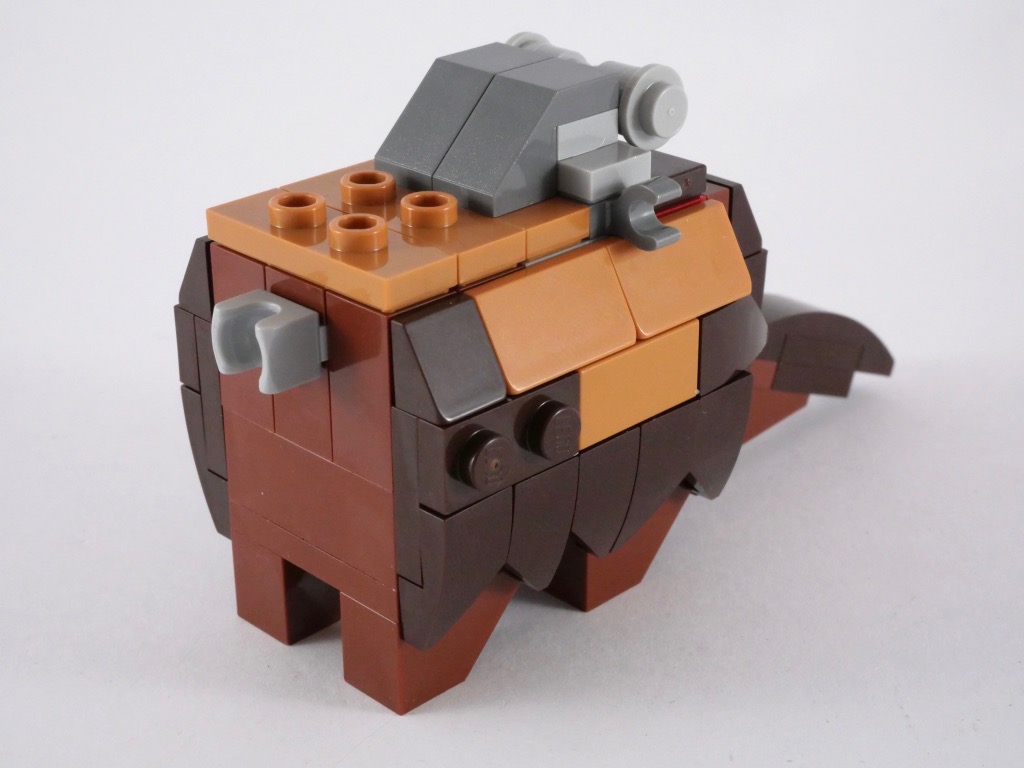 La construction du Bantha est relativement simple. On commence par le corps, constitué pour l’essentiel de briques SNOT. On y ajoute les pattes (des inverted slopes), la fourrure (dont les poils en partie basse sont représentés par des slopes tronquées), et la selle à base de jumpers couleur medium nougat. La queue est clipsée, tandis que la tête est fixée sur un ball joint.