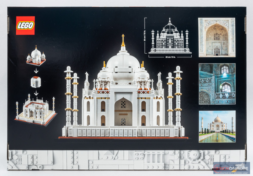 C’est déjà la 3ème interprétation du Taj Mahal que LEGO nous propose avec le set 21056 Taj Mahal. Sorti initialement en 2008 sous la référence 10189, c’était alors le plus gros set LEGO commercialisé avec 5922 pièces. LEGO a permis aux retardataires de l’obtenir à nouveau dans une réédition, presque à l’identique, en 2017 sous la référence 10256. Cette référence a récemment été retirée de la vente, et c’est un modèle plus « raisonnable » en terme de taille (et de prix !) que LEGO nous propose désormais dans la gamme LEGO Architecture. Je ne sais pas si c’est à dessein (et c’est à mon avis plutôt dû au hasard), mais on remarquera que la nouvelle référence (21056) est un anagramme de l’ancienne (10256) 😉