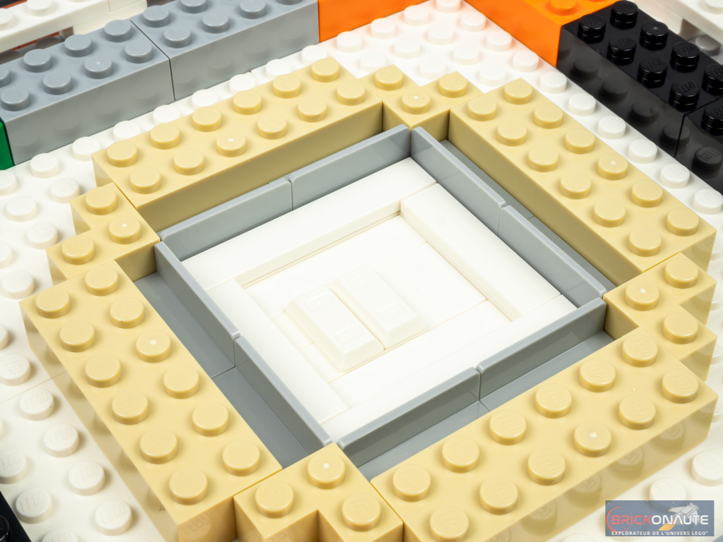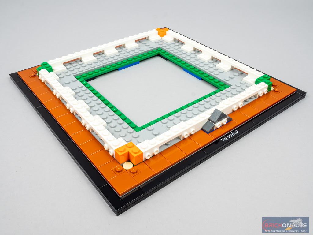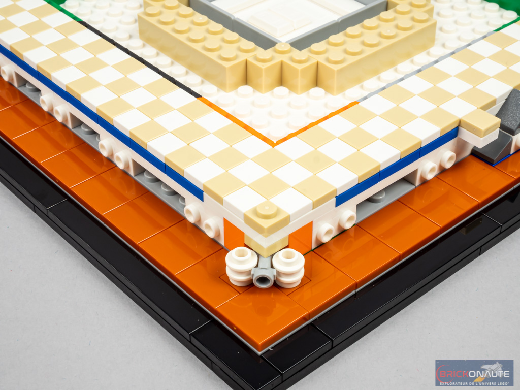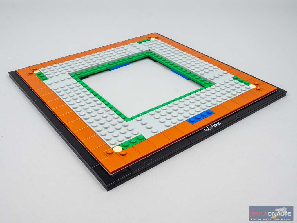 La construction commence comme tous les sets LEGO Architecture : par la base de l’ensemble qui comporte une tile noire tampographiée. Elle est ici de forme carrée, et creuse en son centre. On assemble le pourtour, puis une rangée de « pavage » couleur dark orange au-dessus. Côté intérieur, les plates grises supporteront le monument.