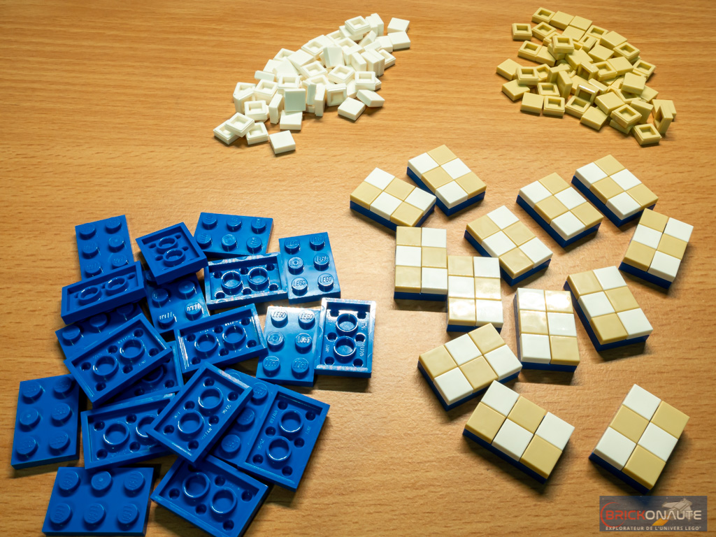 L’étape suivante n’est pas la plus intéressante, et c’est un euphémisme. On y assemble pas moins de 33 sous-ensembles identiques, pavés de petites tiles 1×1 carrées. Et c’est toujours un peu galère à aligner.