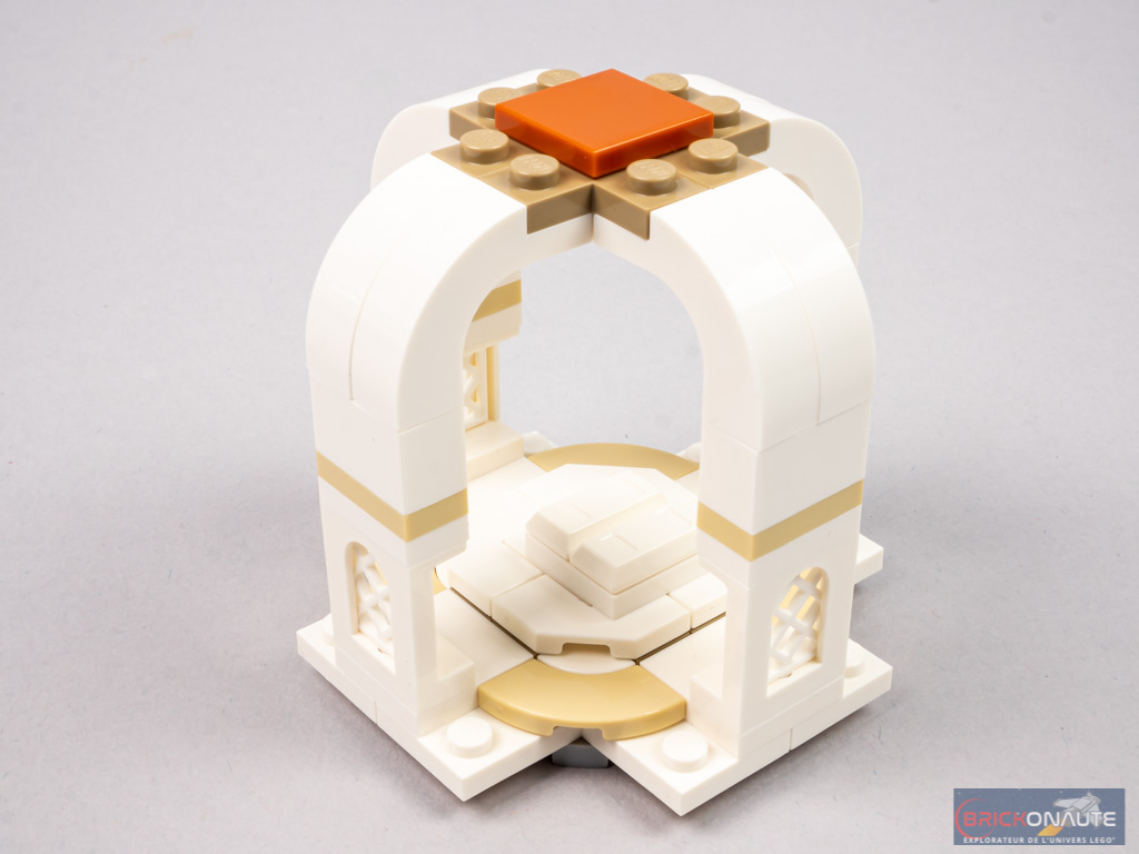 On s’occupe ensuite des 4 iwans (porche très large et haut typique de l’art islamique) principaux, identiques deux à deux. Au sol, on retrouve les pavages déjà réalisés aux étapes précédentes. La forme caractéristique de ces éléments est élégamment reproduite avec des brick with bow disposées en vis à vis. On remarquera également ici les grilles blanches dans les fenêtres, une nouvelle couleur pour ces éléments introduite dans ce set.