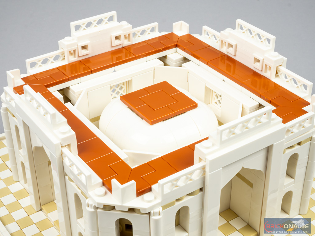 D’une manière générale, l’aspect extérieur de la partie centrale est superbe, tout en courbes au niveau des porches (iwans) mais surtout des dômes. La réalisation du dôme central et sa forme « d’oignon » n’était d’ailleurs pas chose aisée mais le designer s’en tire particulièrement bien. J’apprécie également l’utilisation d’éléments de couleurs tan qui, s’ils n’existent pas pour le vrai Taj Mahal, permettent de souligner des reliefs impossibles à réaliser en LEGO à cette échelle.