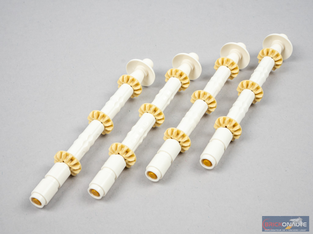 Nous attaquons le dernier sachet de pièces avec l’assemblage des 4 petits dômes soutenus par des colonnes, ici représentés par des robotic arms. La pointe est réalisée avec des baguettes magiques issues de la gamme LEGO Harry Potter. On termine l’assemblage du Taj Mahal avec les 4 minarets, où on remarquera l’utilisation d’engrenages Technic à but décoratif.