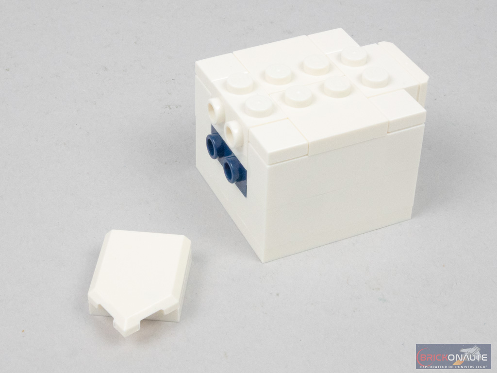 Pour EVE, la construction du corps renferme une petite surprise : il est creux, et une plante s’y cache. Typiquement le genre de détails que j’adore. LEGO BrickHeadz oblige, la forme ovoïde du corps est simplifiée, avec l’utilisation de slopes inversées à double rampant en partie basse. On la pose sur une brique transparente pour qu’elle « flotte ». La tête est assez classique et renferme une brique rose, on « l’habille » sur ses différentes faces pour obtenir une forme arrondie. Les yeux sont ici simplement représentés par des petites round tiles bleues, ça fonctionne bien.