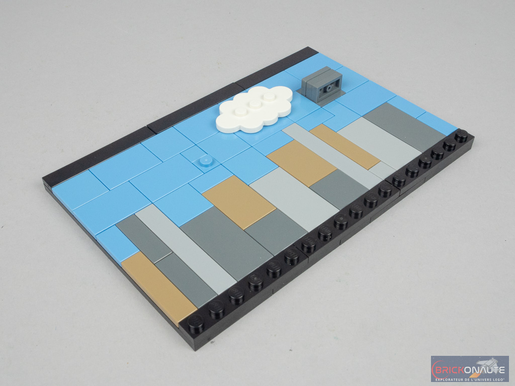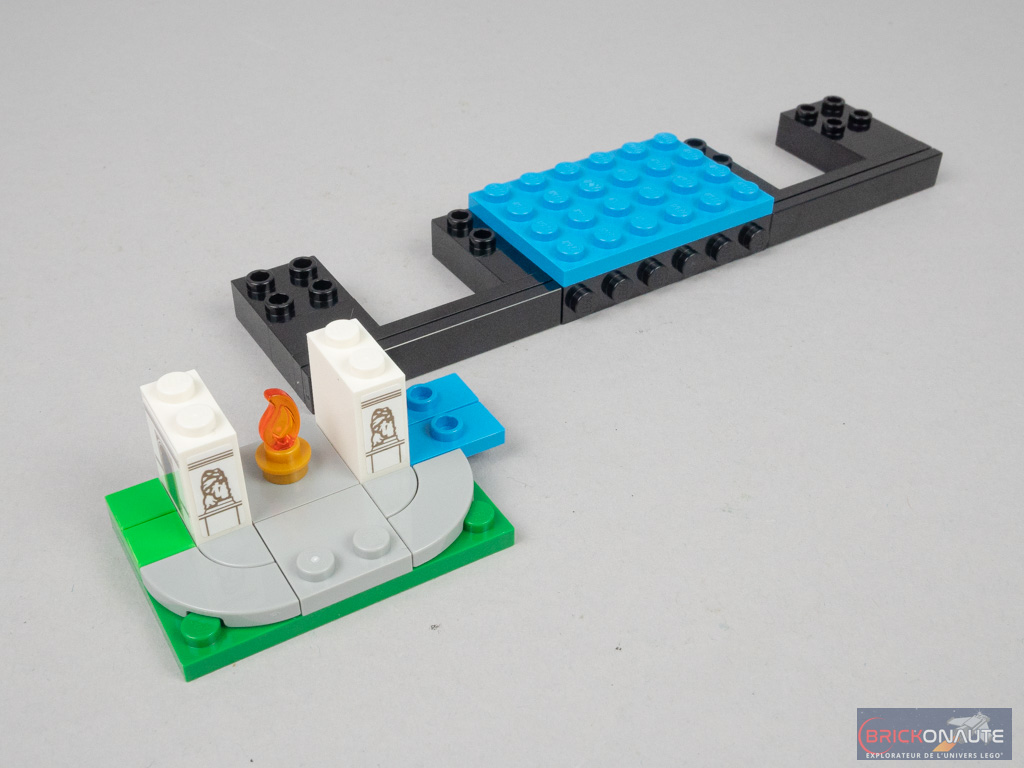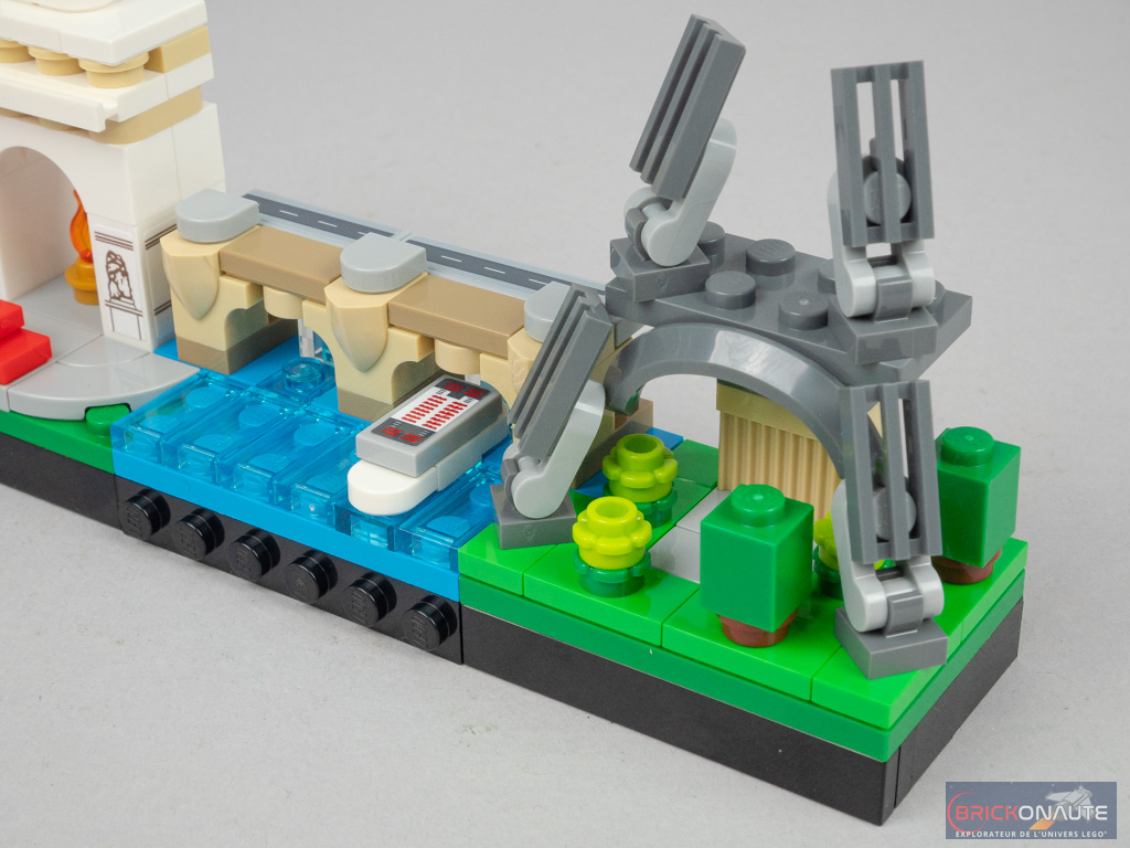 La construction s’articule de la même manière que les autres cartes postales de cette « collection » : le premier sachet de pièces sert à réaliser le fond, et ceux portant le numéro 2 les différents bâtiments et décors. Autant dire que la première étape est vite expédiée et pas très intéressante. La seconde l’est un peu plus. Et même si ce n’est pas transcendant, les constructions ont au moins le mérite d’être variées. La Tour Eiffel est construite en deux morceaux : une partie sur le support d’exposition (avec un passage de roue en guise d’arche, pourquoi pas), et l’autre sur la partie verticale, fixée grâce à des éléments SNOT.