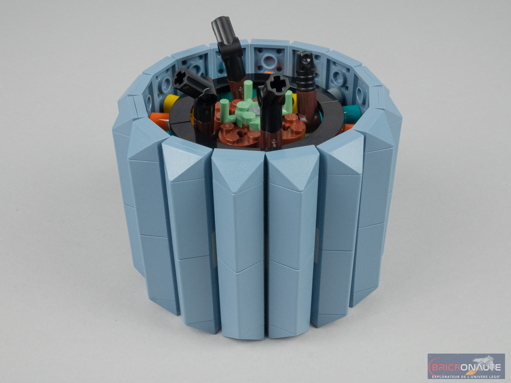 La structure interne du pot est très bien pensée : 4 sous-ensembles se superposent et s’alignent comme il faut grâce à des turntables, avant d’être solidarisés par des beams Technic. La suite est très répétitive puisqu’on habille cette structure. Néanmoins le jeu en vaut la chandelle, et le résultat est vraiment joli.
